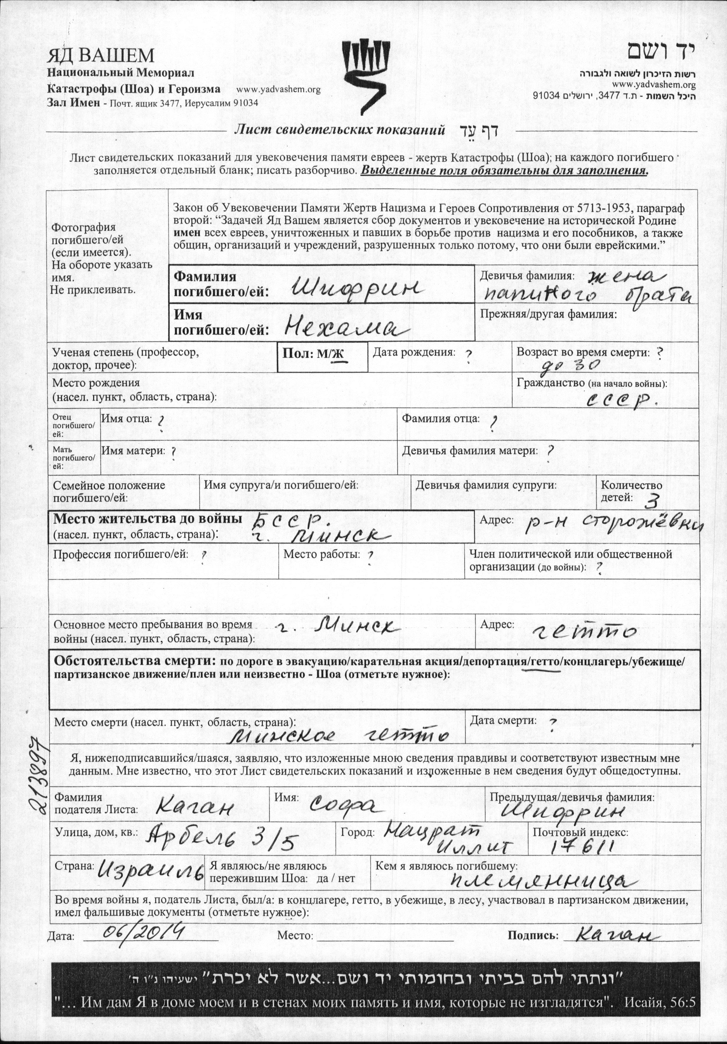 Shifrin Nekhama Minsk, Bélorussie (URSS) Feuille de témoignage