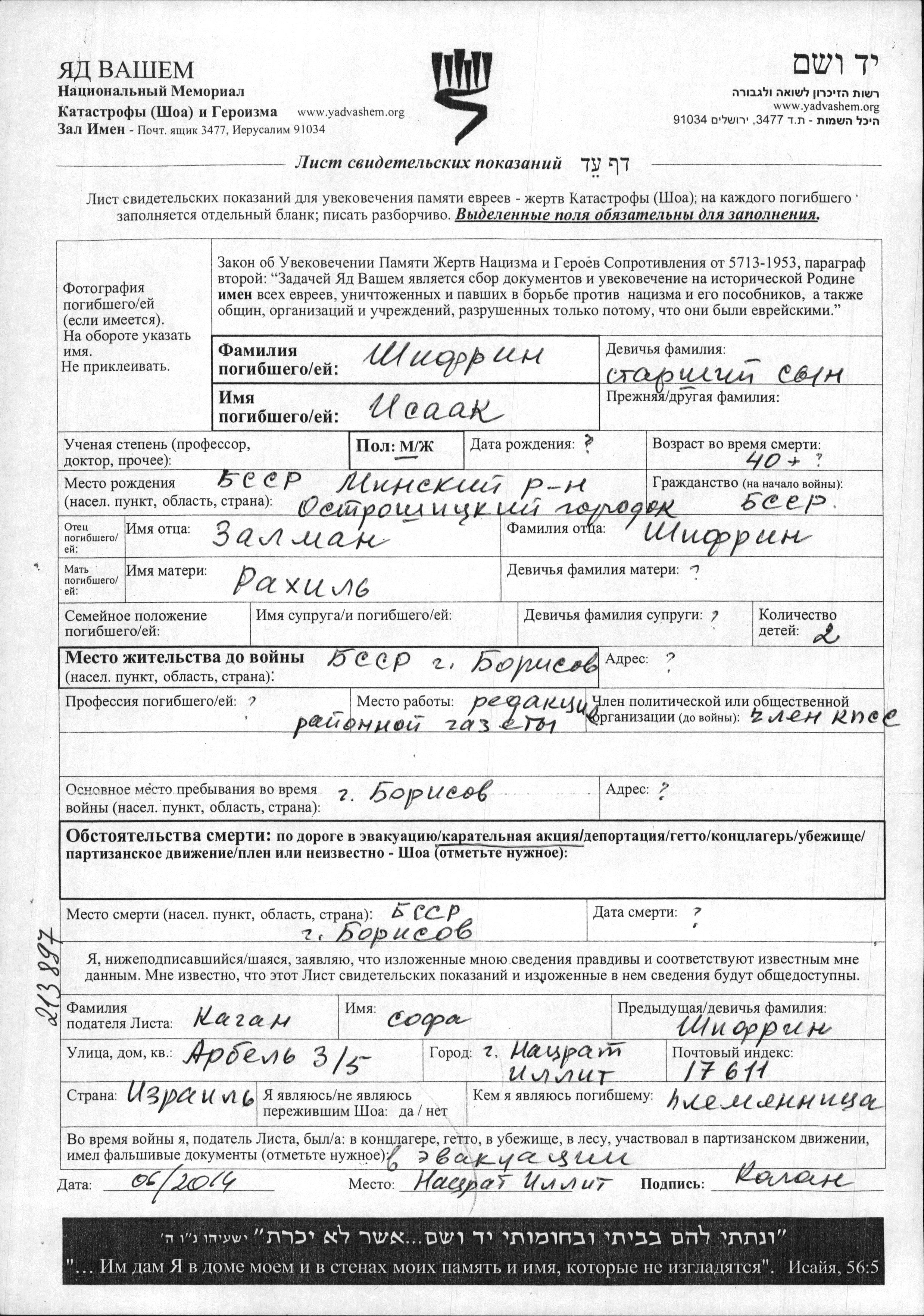 Shifrin Isaak Borisov, Bélorussie (URSS) Feuille de témoignage