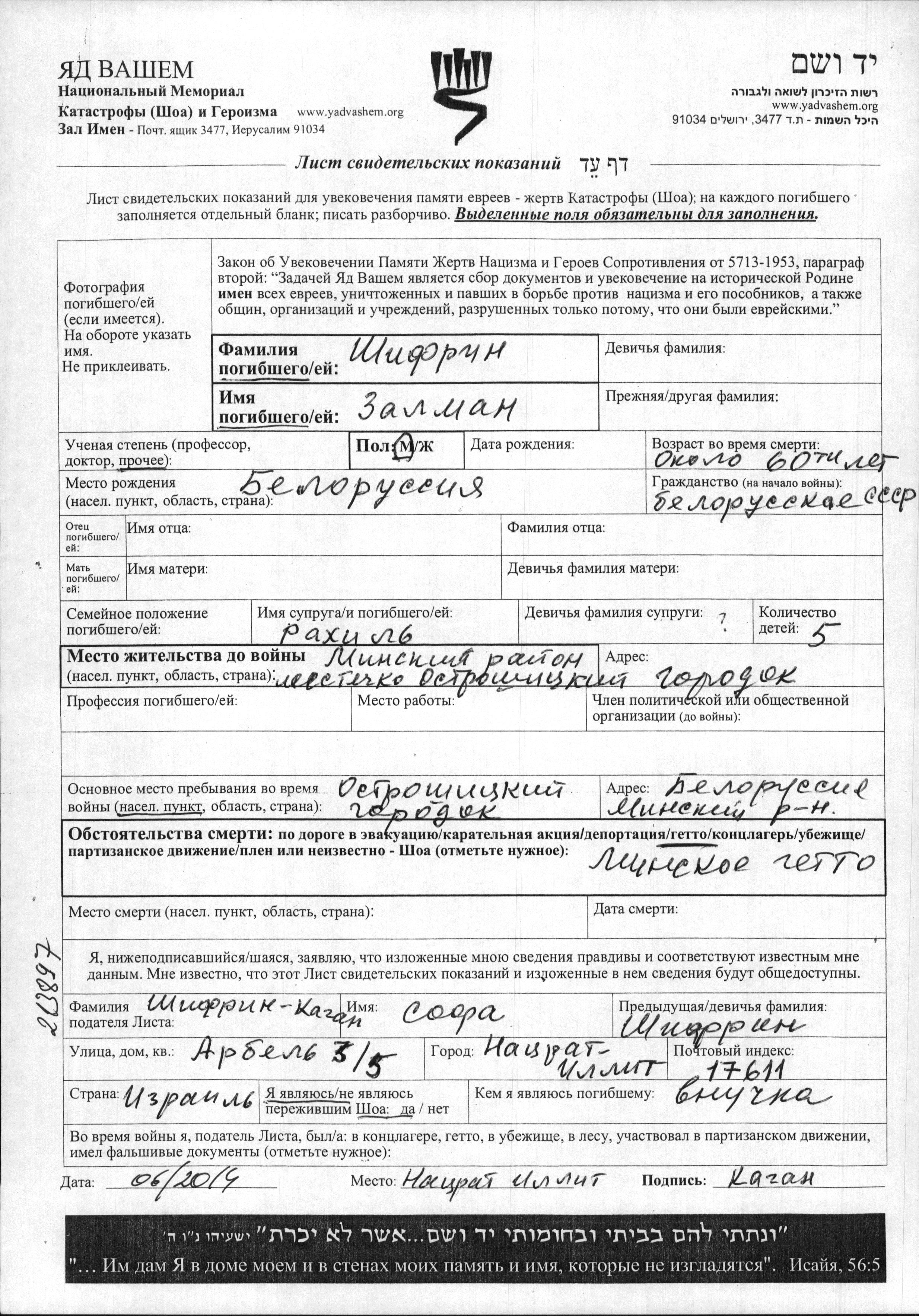 Zalman Shifrin est né à Bélorussie (URSS). Il était Mariée à Rakhil. Avant la seconde guerre mondiale il vivait à Ostroshitskiy Gorodok, Bélorussie (URSS). Au cours de la guerre, il était à Minsk, Bélorussie (URSS).