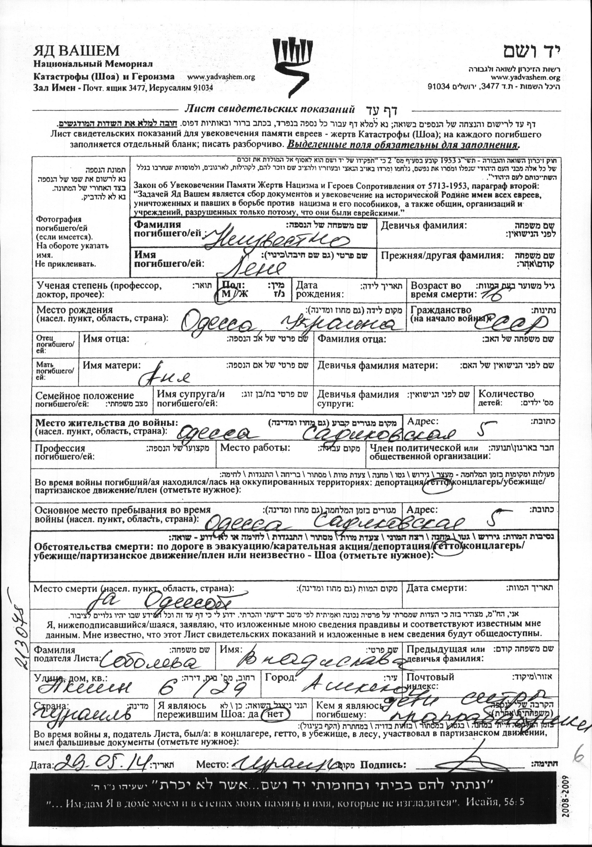 Lyonya a été assassiné pendant la Shoah. Lieu de la mort: Odessa, Ukraine (URSS).