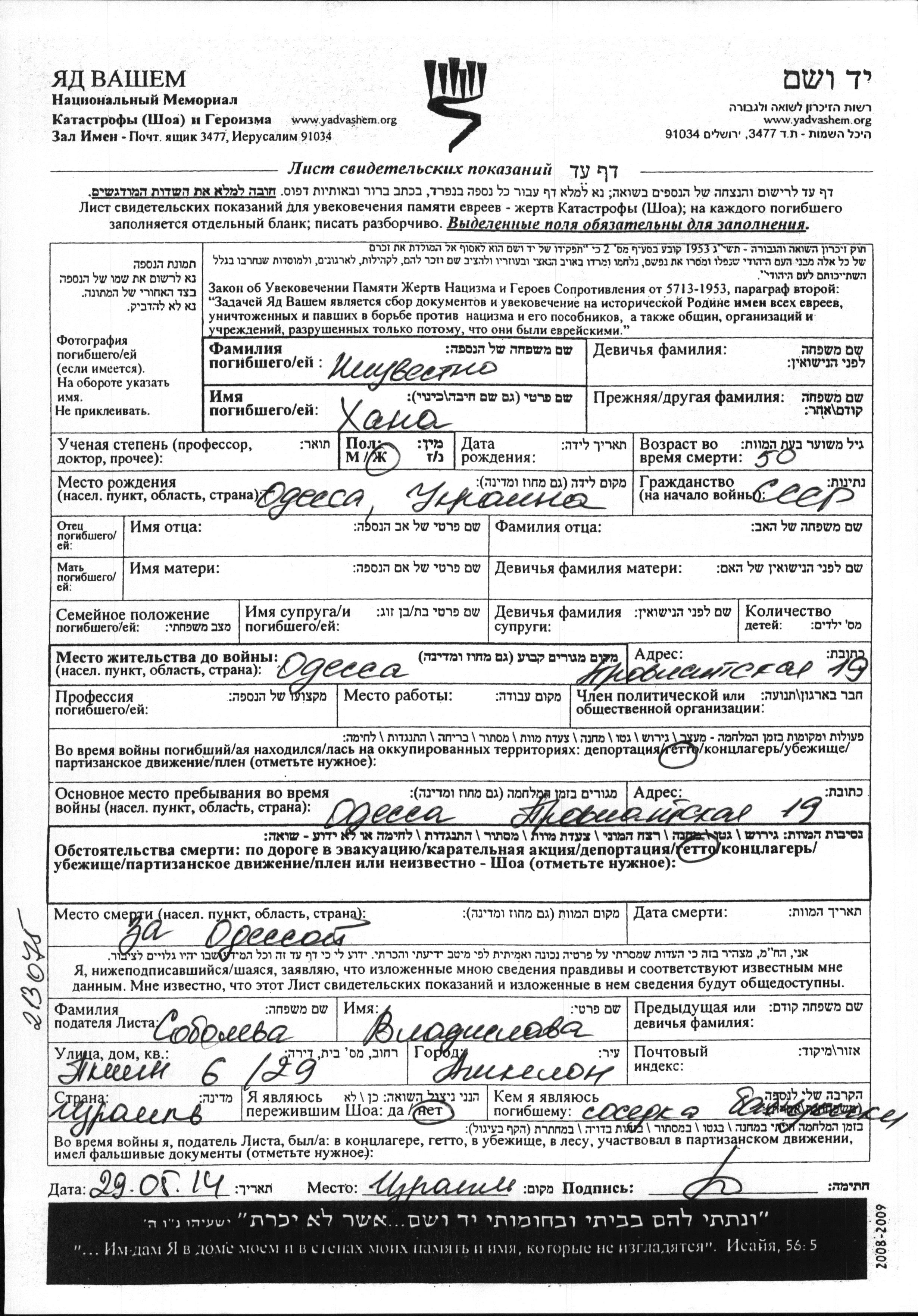 Khana a été assassinée pendant la Shoah. Lieu de la mort: Odessa, Ukraine (URSS).