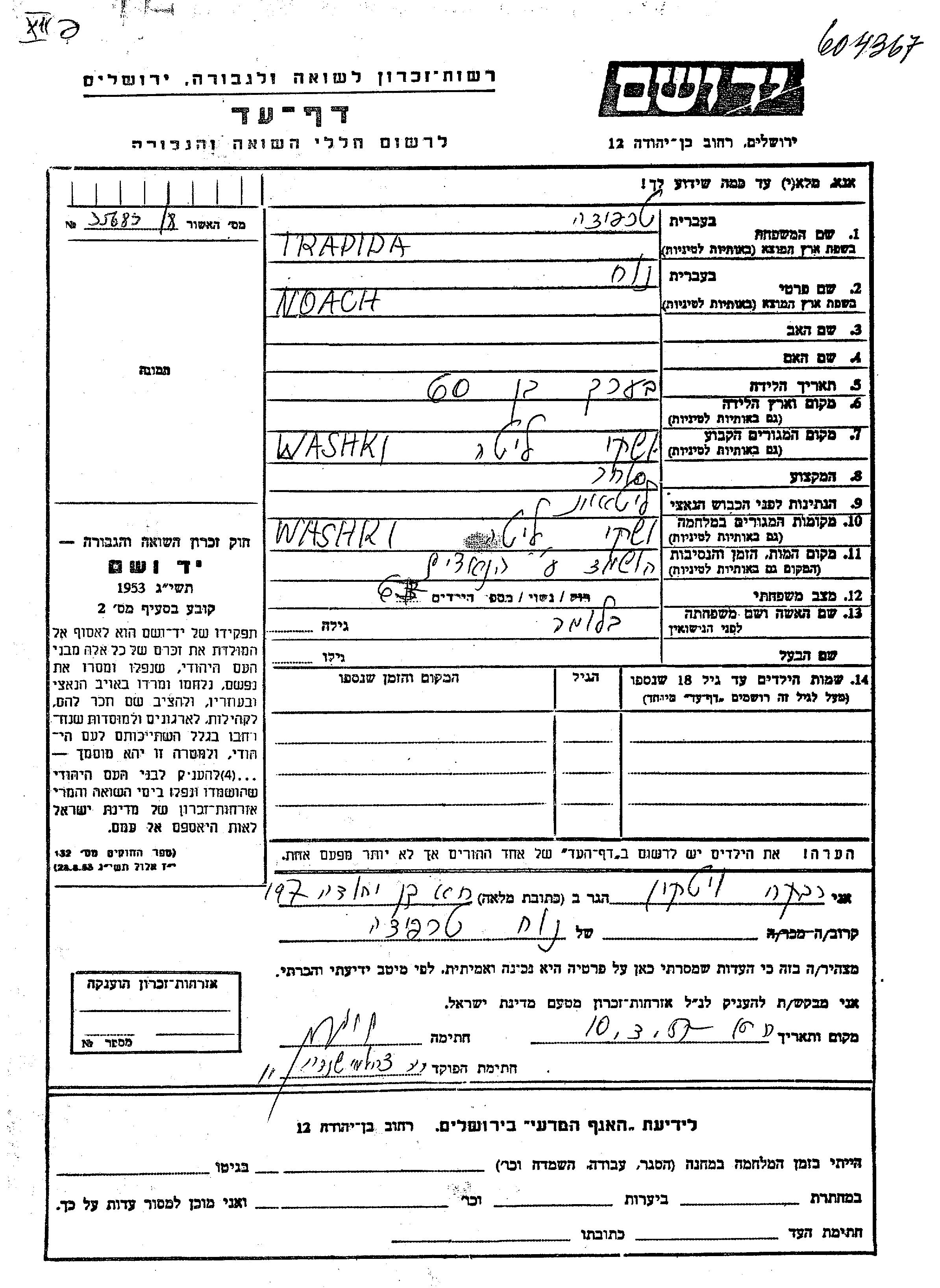 Trapida Noach Vashki, Lituanie Feuille de témoignage