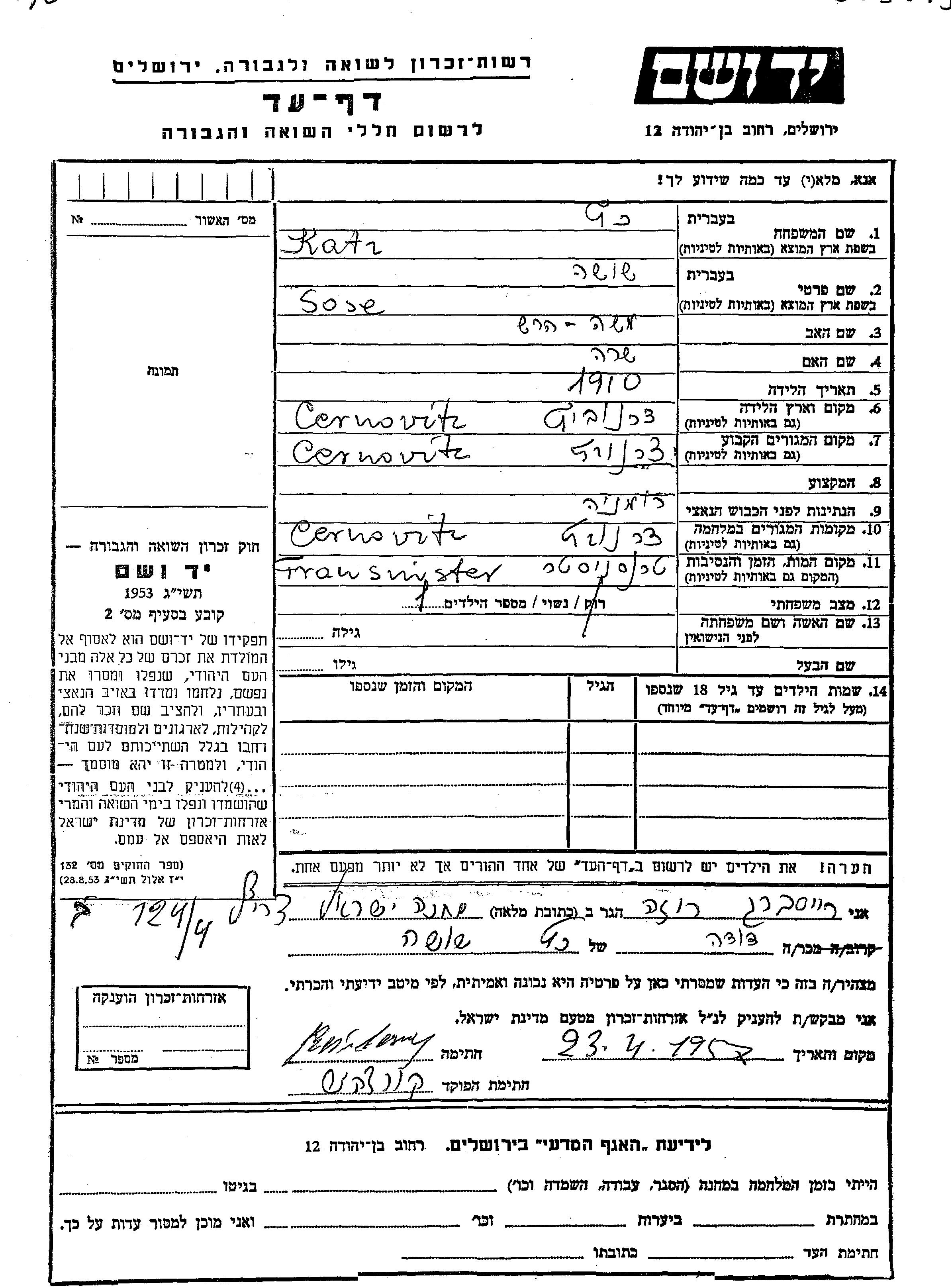 Katz Sose 1910 Cernovitz, Roumanie Feuille de témoignage