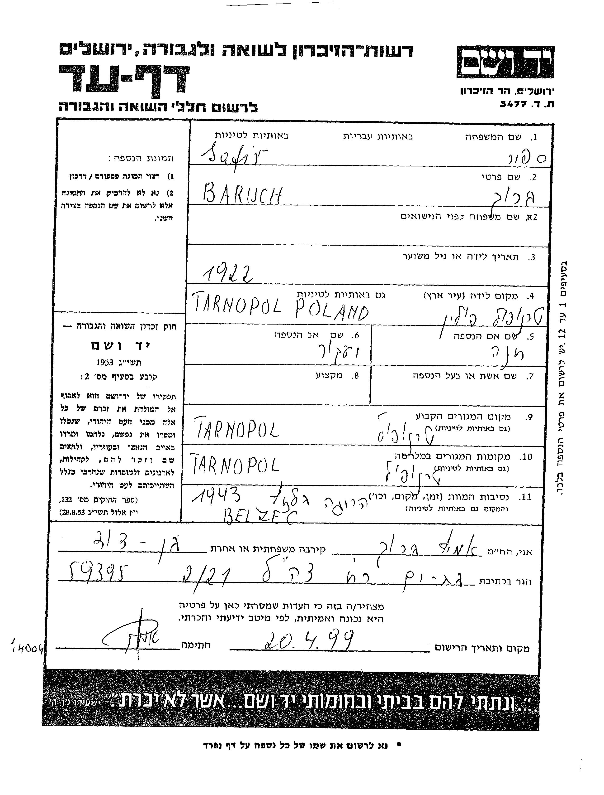 Safir Baruch 1922 Tarnopol, Pologne Feuille de témoignage