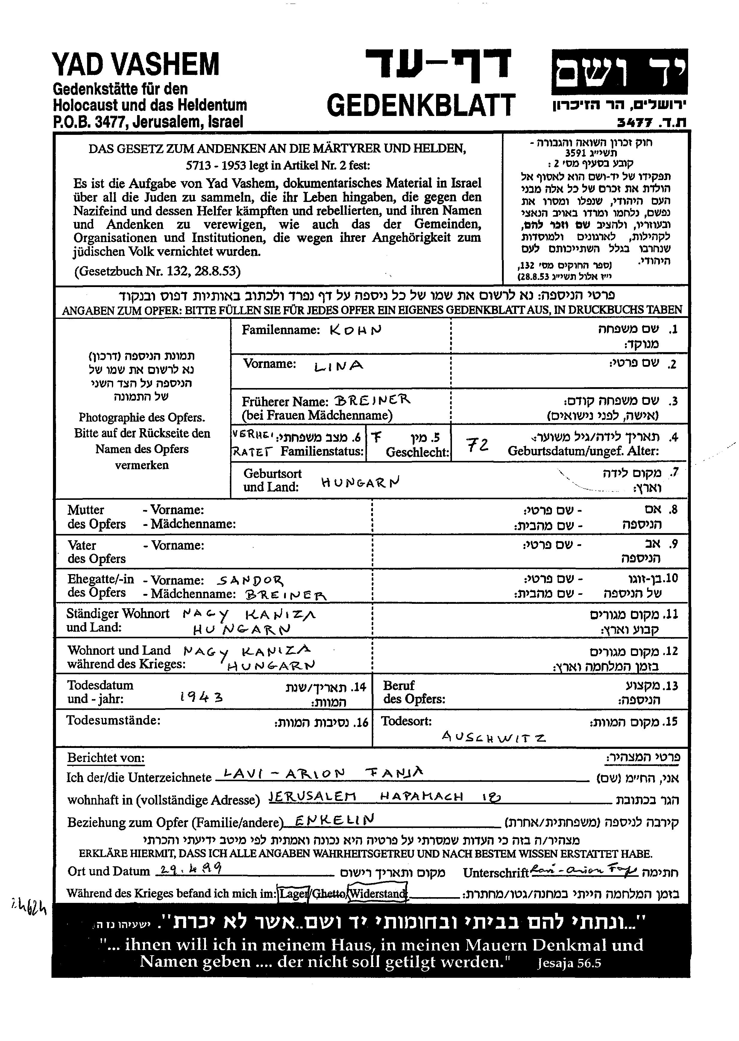Breiner Lina Nagy Kanizsa, Hongrie Feuille de témoignage