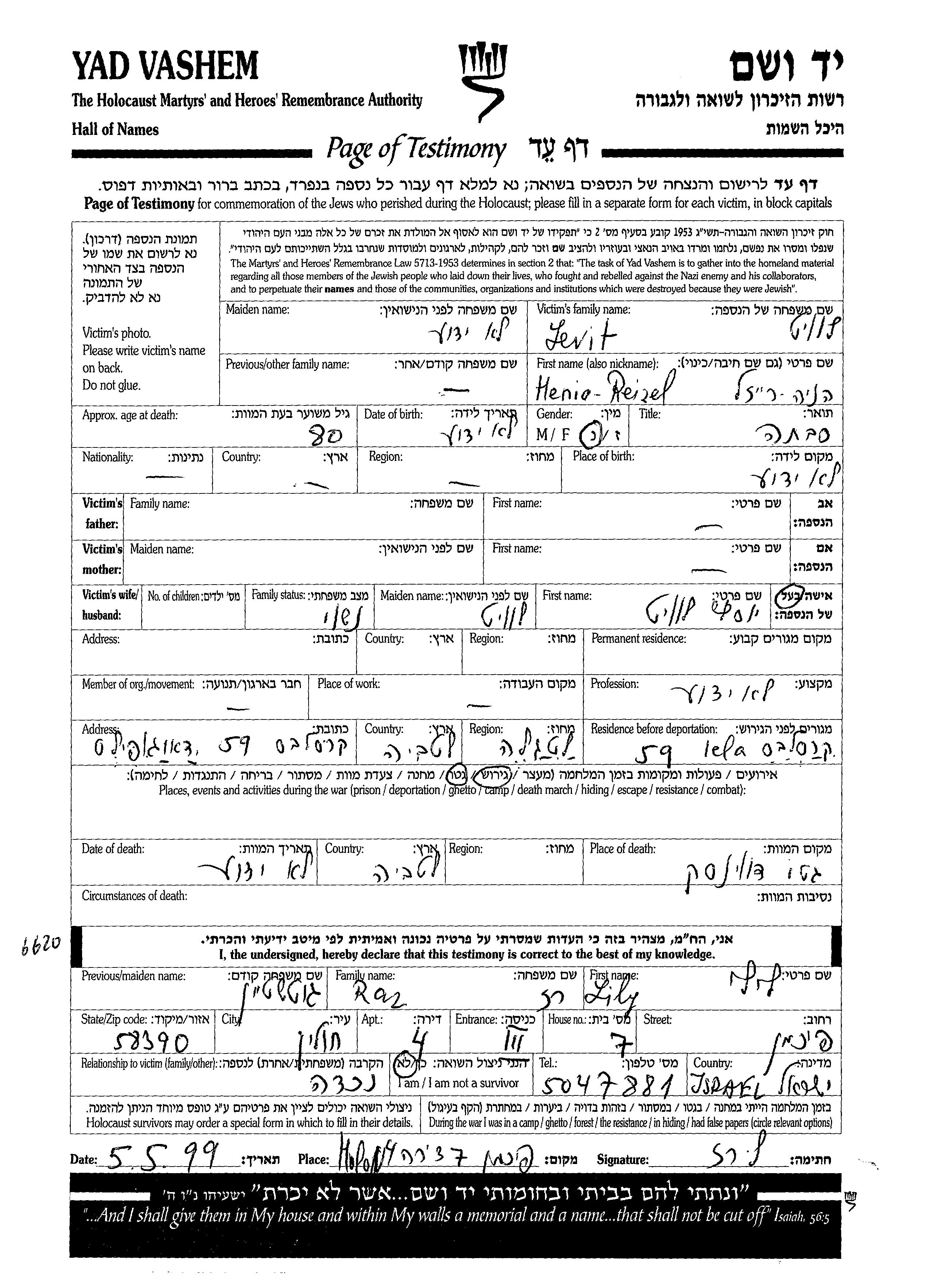 Levit Henio Reizl Henia endroit inconnu, Feuille de témoignage