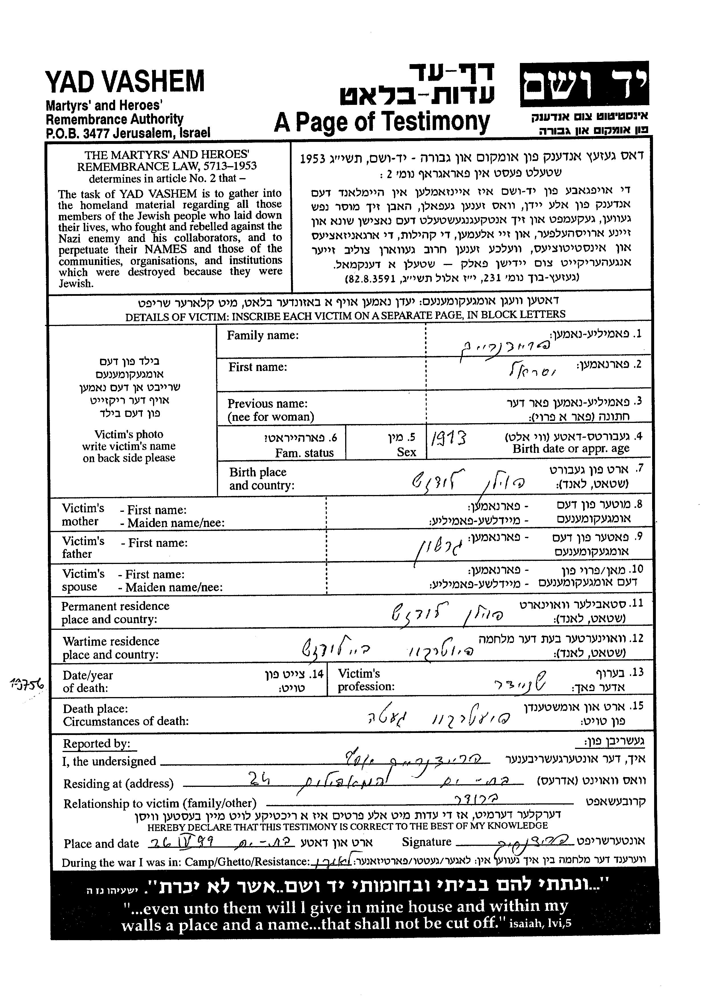 Yisrael a été assassiné pendant la Shoah. Lieu de la mort: Piotrkow Trybunalski, Pologne.