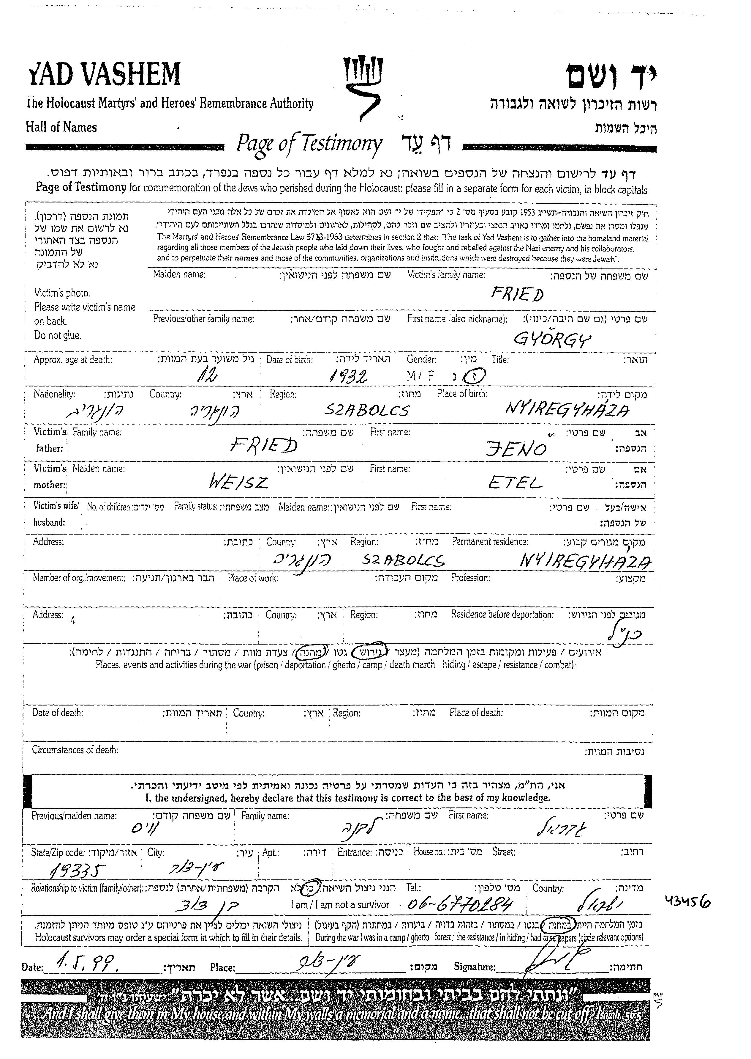 Fried Gyorgy 1932 Nyiregyhaza, Hongrie Feuille de témoignage
