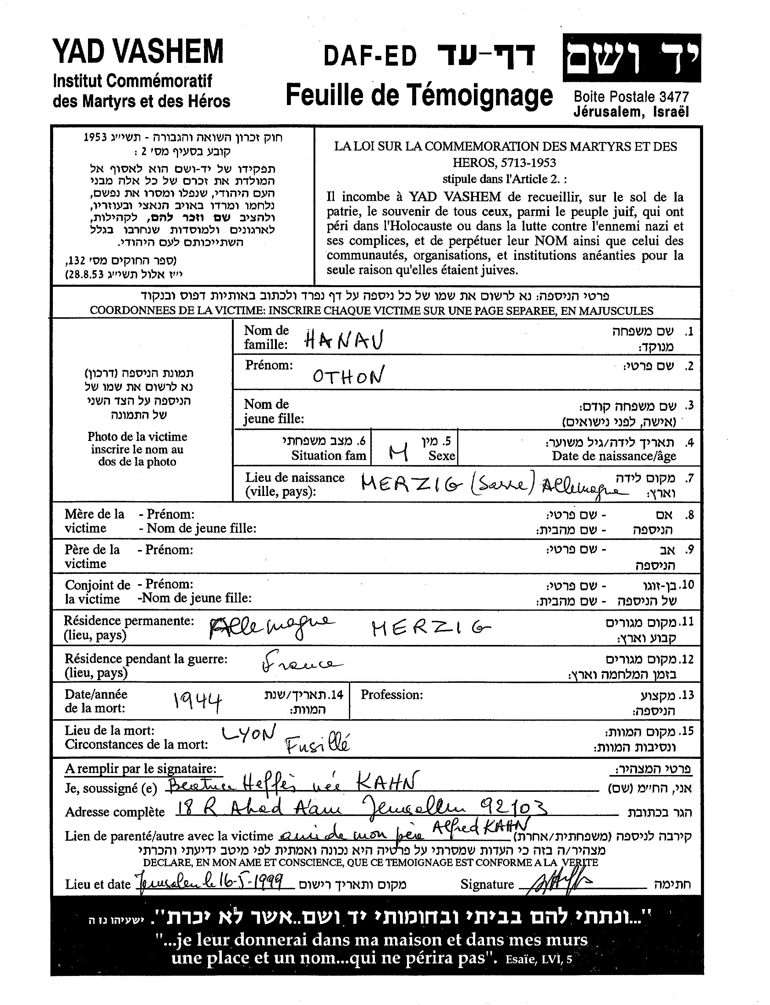 Hanau Othon Merzig, Allemagne Feuille de témoignage