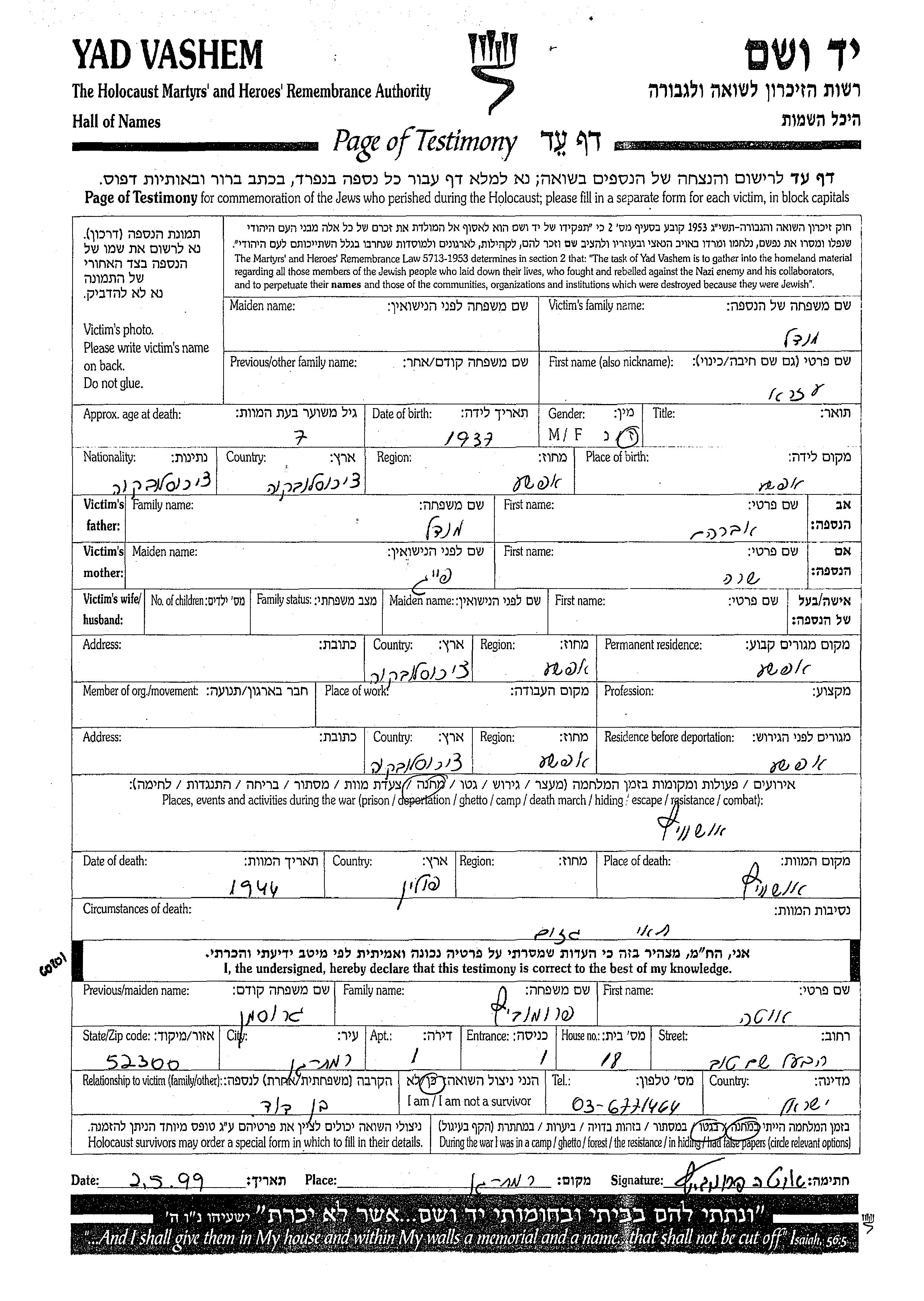 Yad Vashem - Pages of Testimony Names Memorial Collection