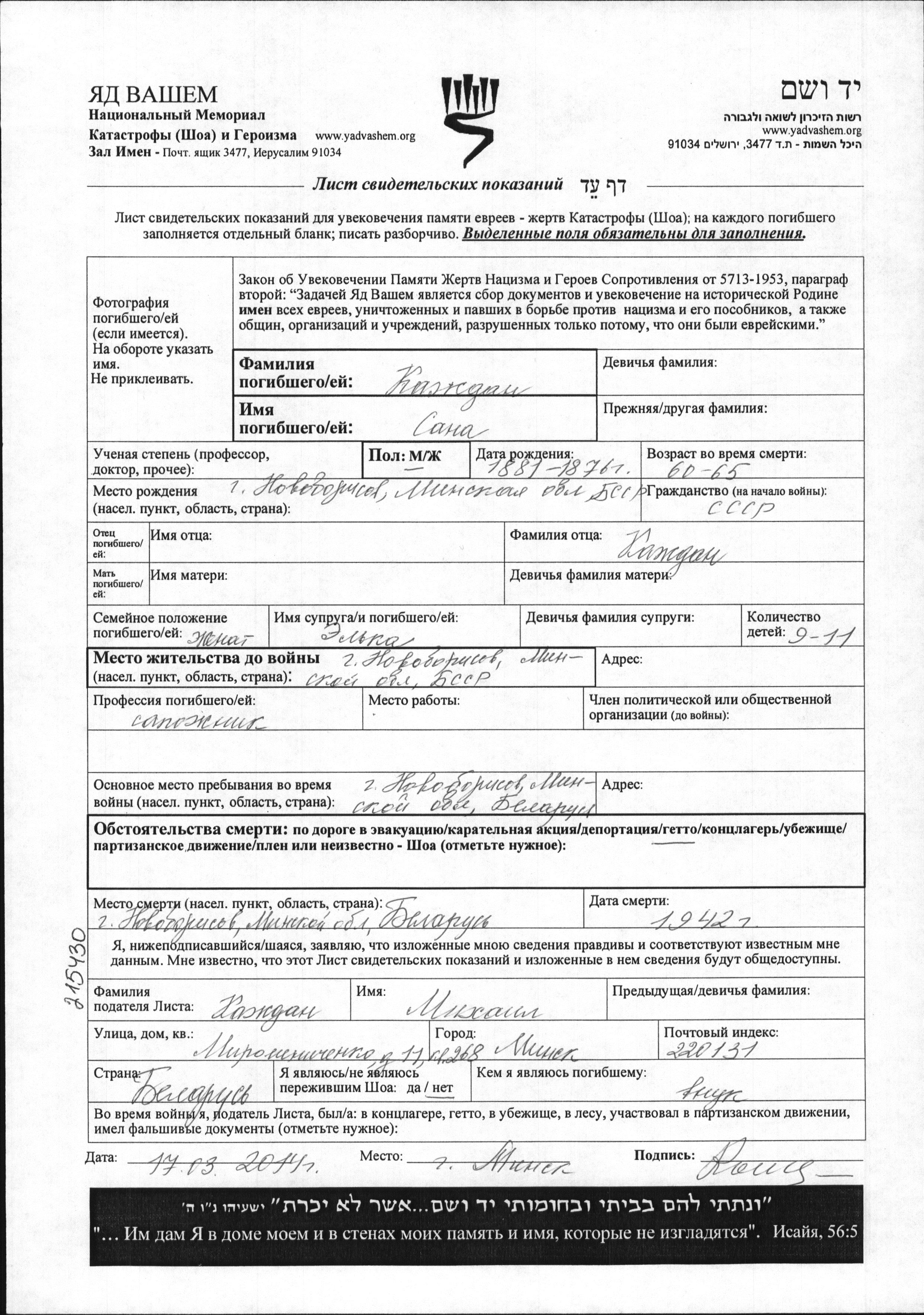 Sana Kazhdan est né à Novo Borisov, Bélorussie (URSS) en 1881. Il était Cordonnier et Mariée à Elka. Avant la seconde guerre mondiale il vivait à Novo Borisov, Bélorussie (URSS). Au cours de la guerre, il était à Novo Borisov, Bélorussie (URSS).