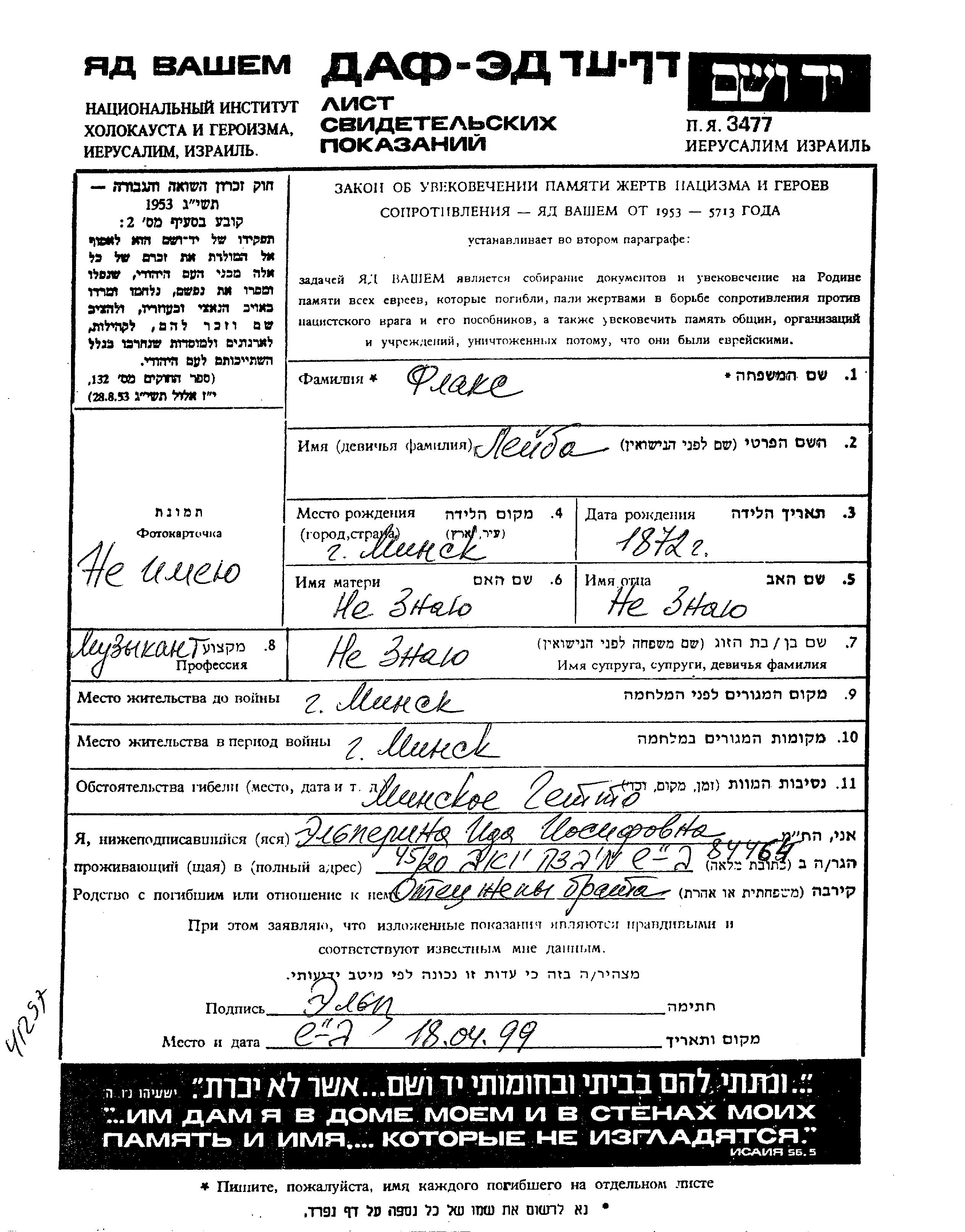 Flaks Leiba 1872 Minsk, Bélorussie (URSS) Feuille de témoignage