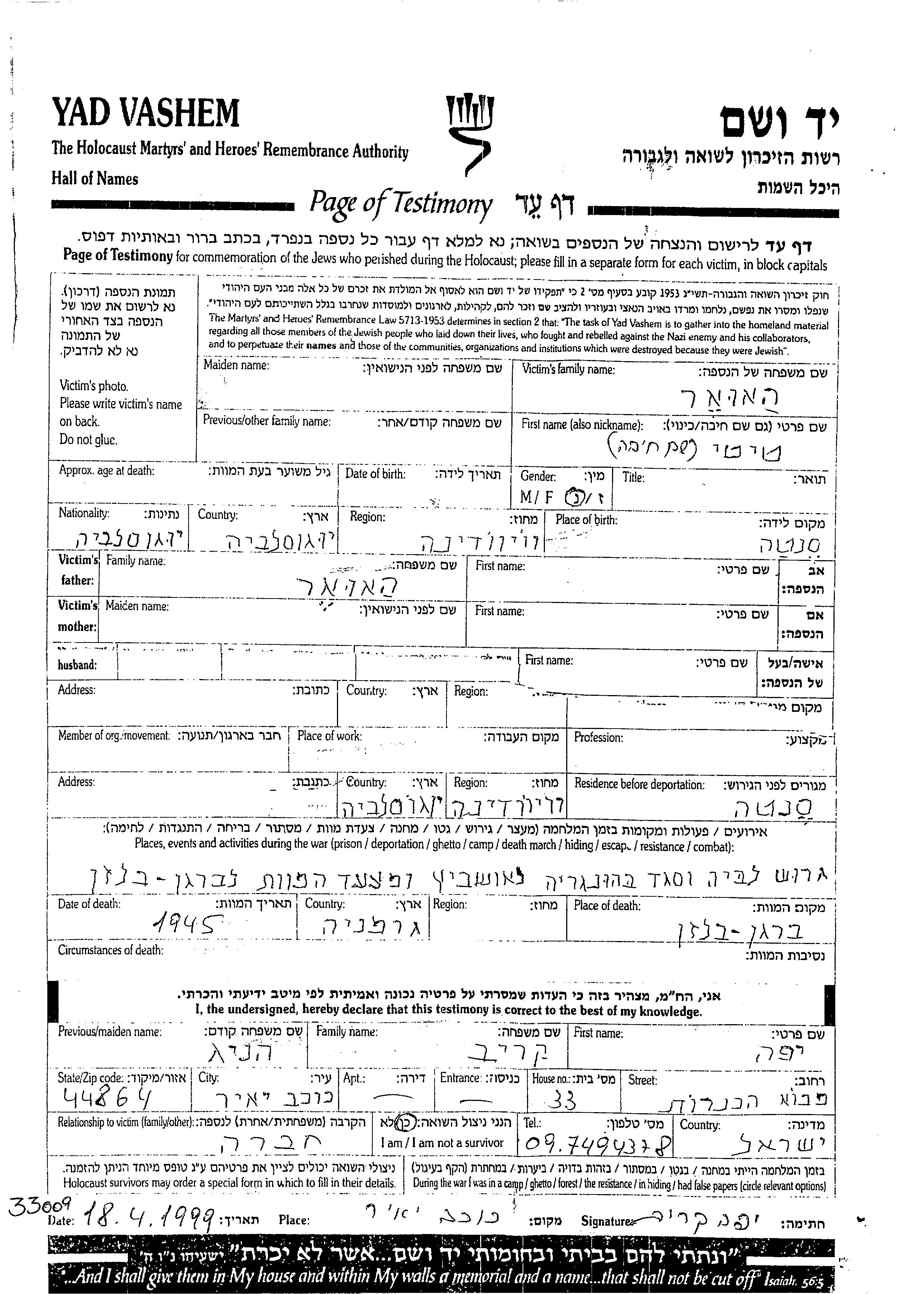 Yad Vashem - Pages of Testimony Names Memorial Collection