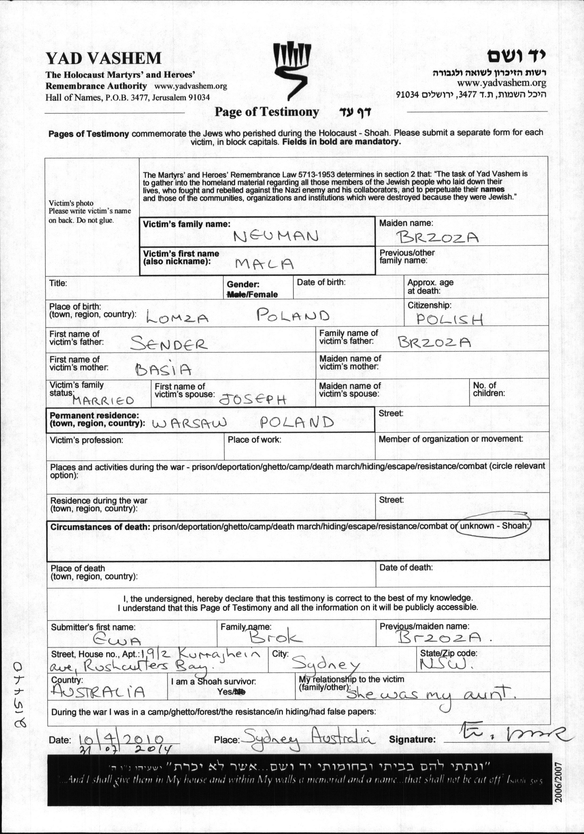 Mala Neuman née Brzoza est née à Łomża, Pologne, fille de Sender et de Basia. Elle était Mariée à Joseph. Avant la seconde guerre mondiale elle vivait à Warsaw, Pologne.