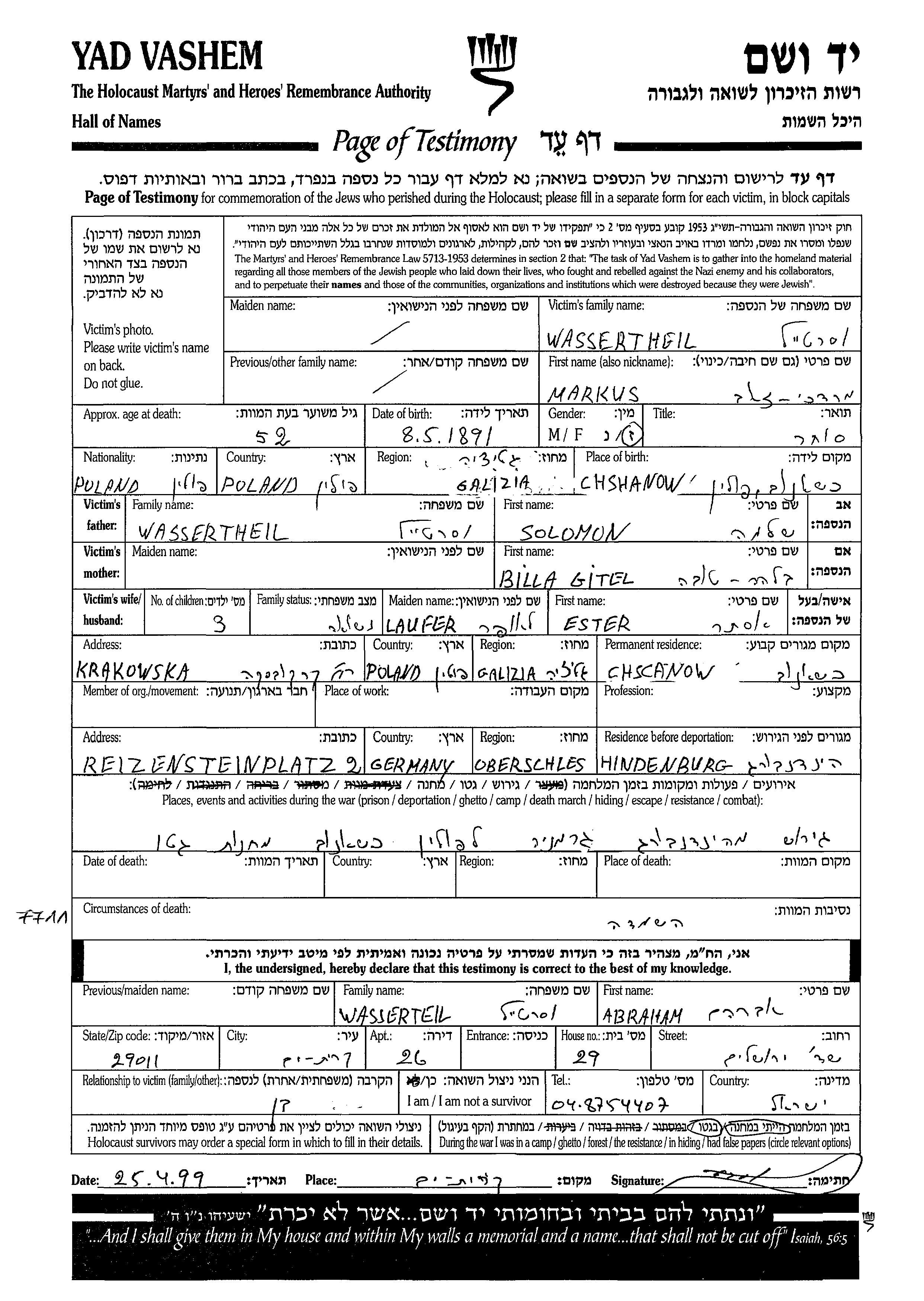 Wassertheil Mordekhai Zeev Markus 1891 Chsanov, Pologne Feuille de témoignage