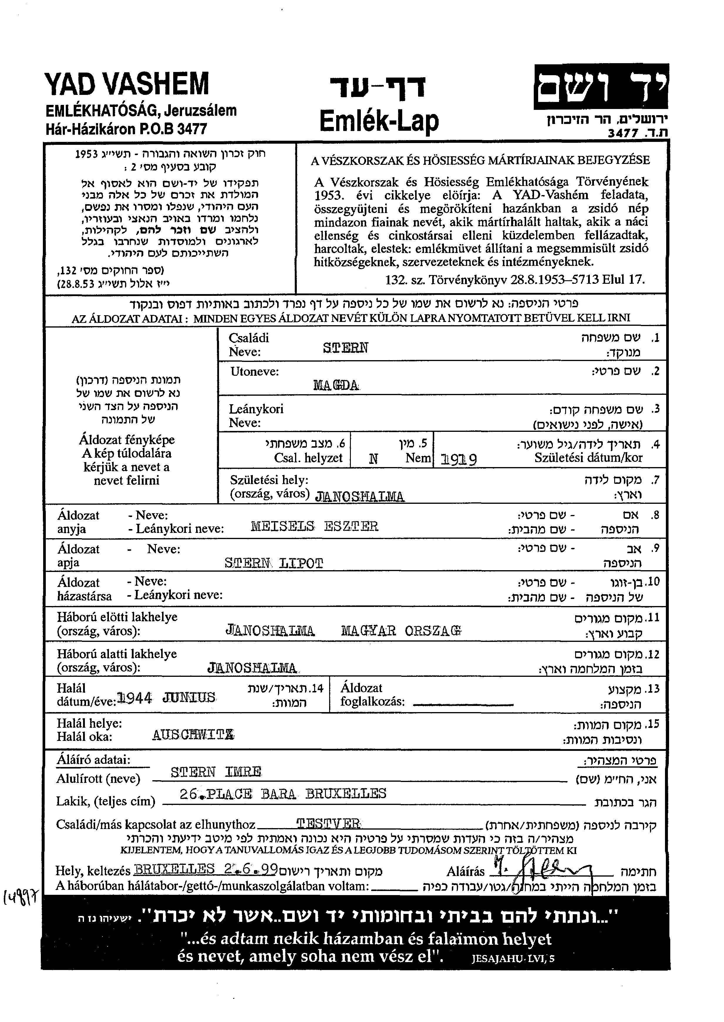Stern Magda 1919 Janoshalma, Hongrie Feuille de témoignage