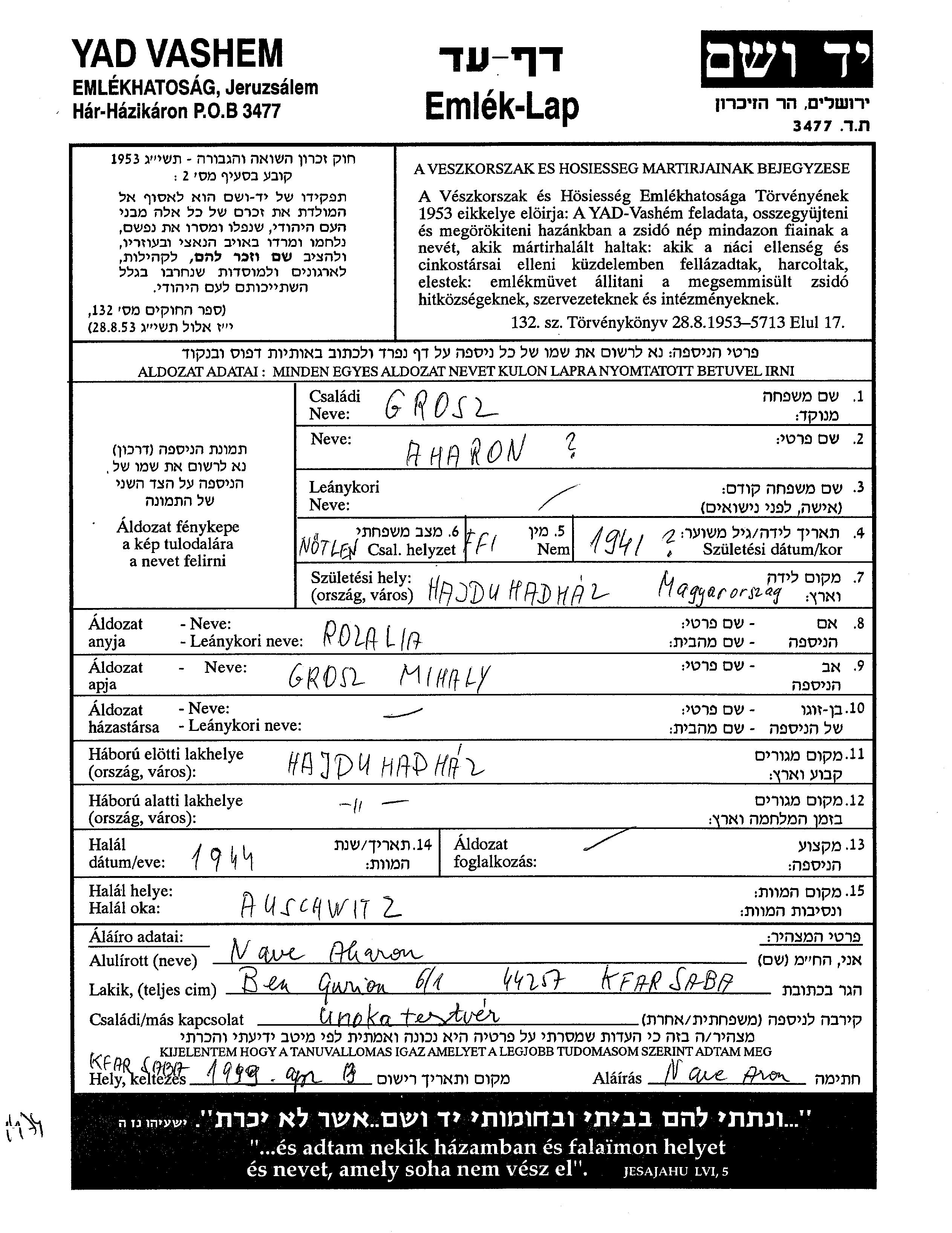 Grosz Aharon 1941 Hajdu Hadhaz, Hongrie Feuille de témoignage