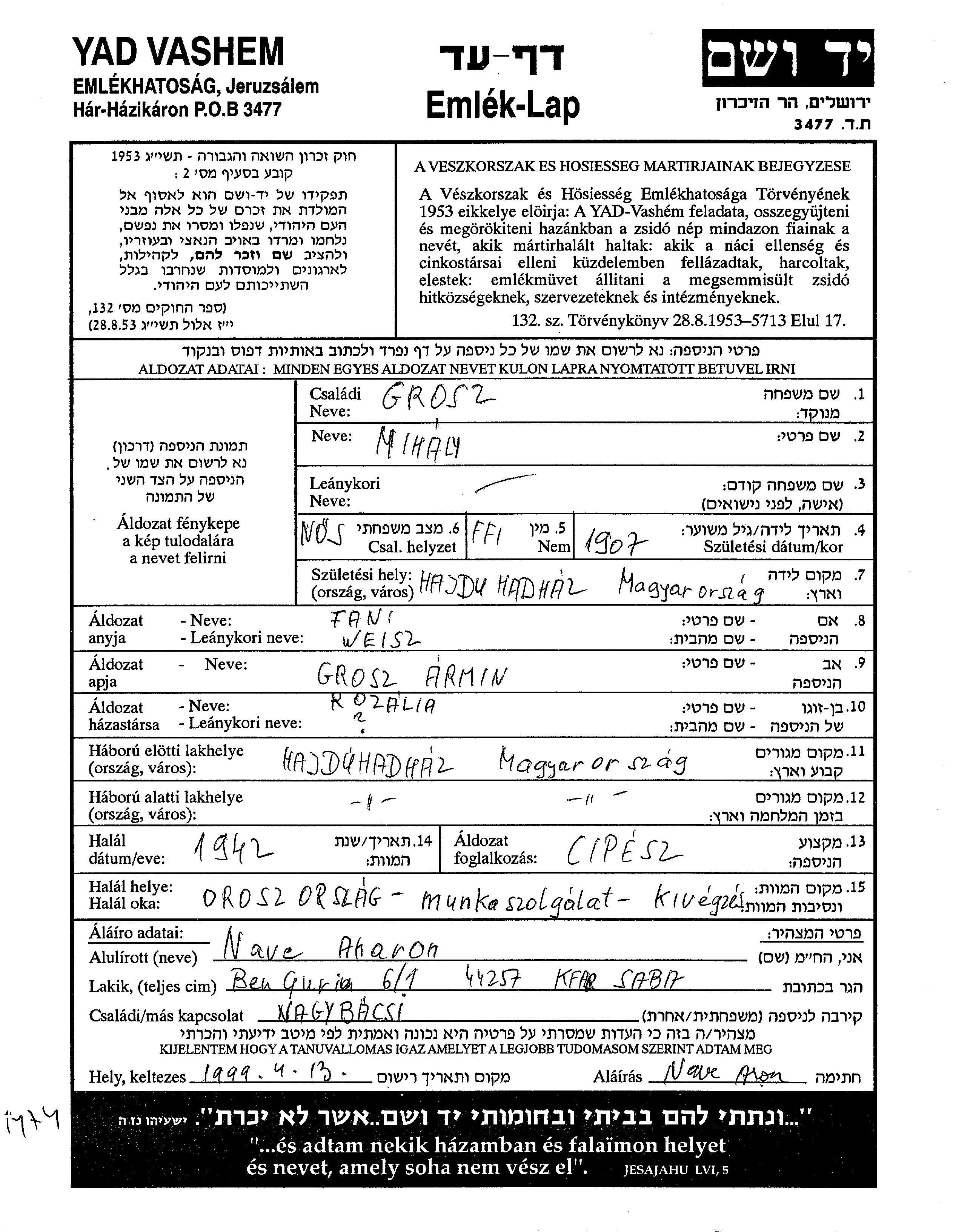 Mihaly Grosz est né à Hajdu Hadhaz, Hongrie en 1907, fils de Armin et de Fani. Il était Cordonnier et Mariée à Rozalia. Avant la seconde guerre mondiale il vivait à Hajdu Hadhaz, Hongrie. Au cours de la guerre, il était à Hajdu Hadhaz, Hongrie.