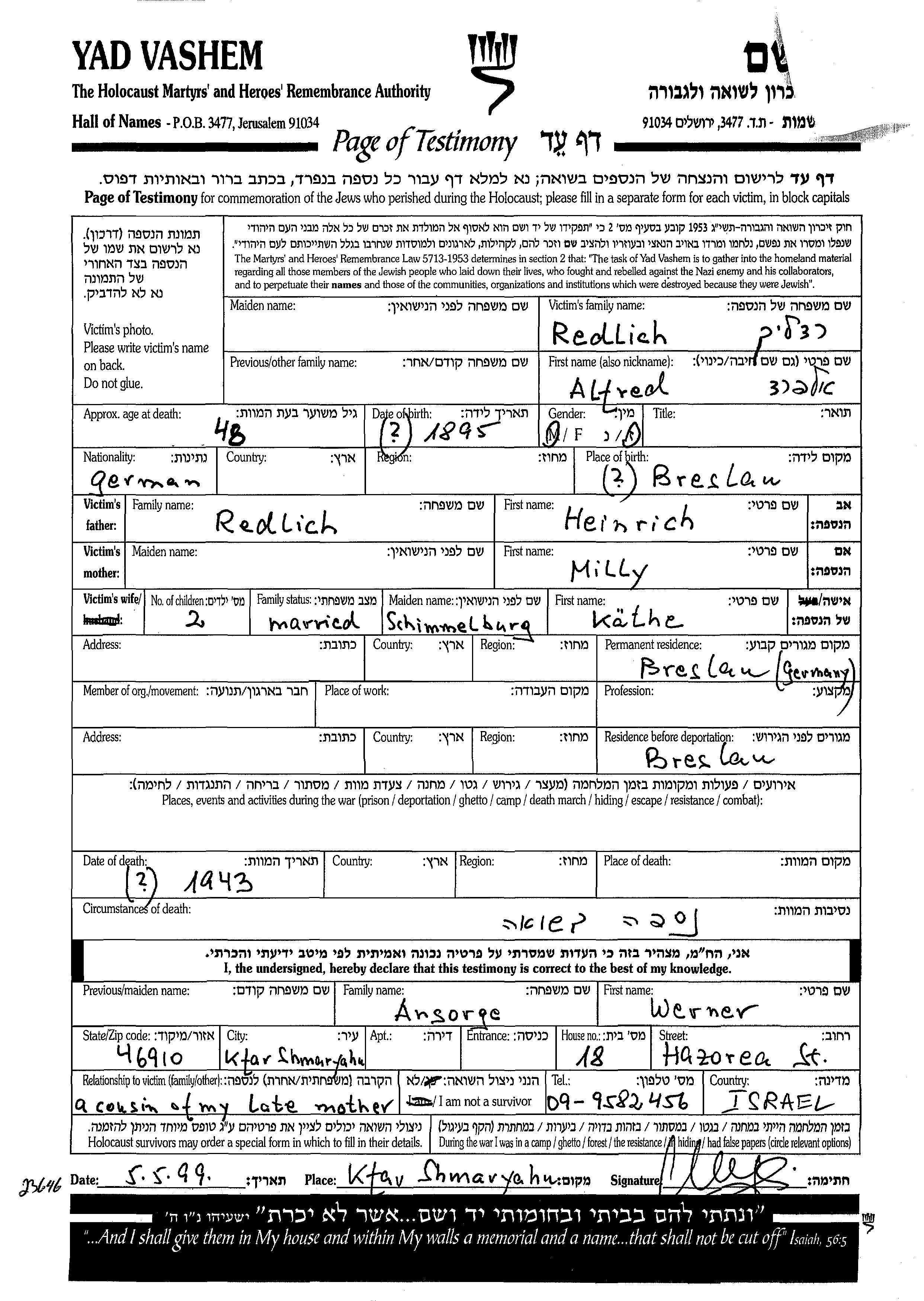 Redlich Alfred 1895 Breslau, Allemagne Feuille de témoignage