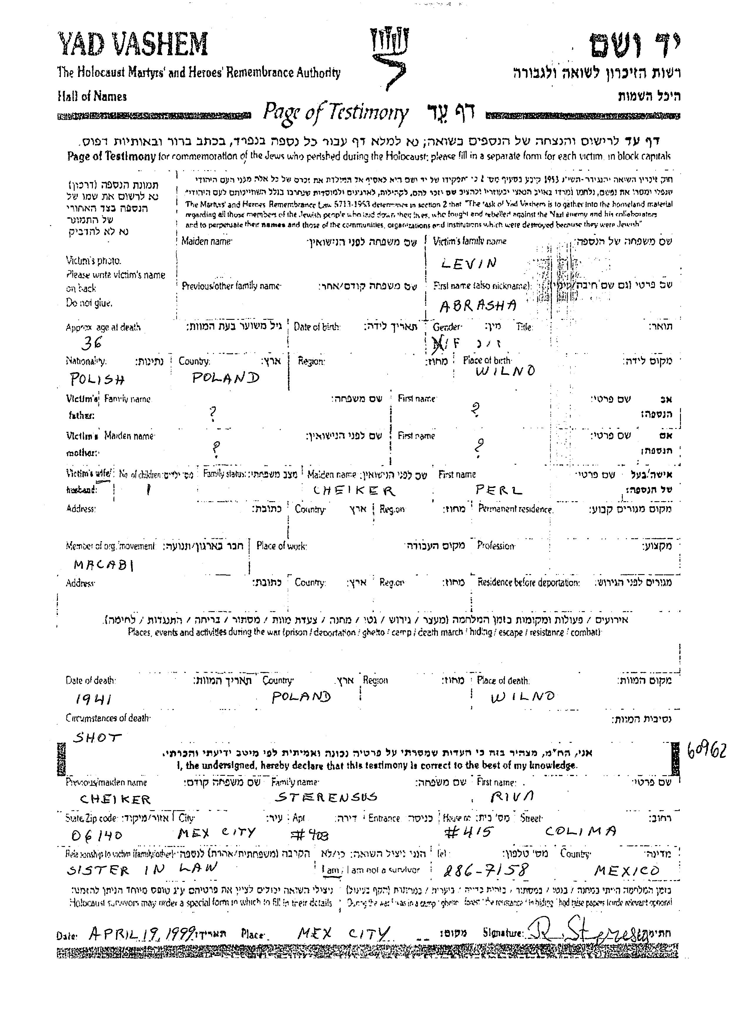 Levin Abrasha endroit inconnu, Feuille de témoignage