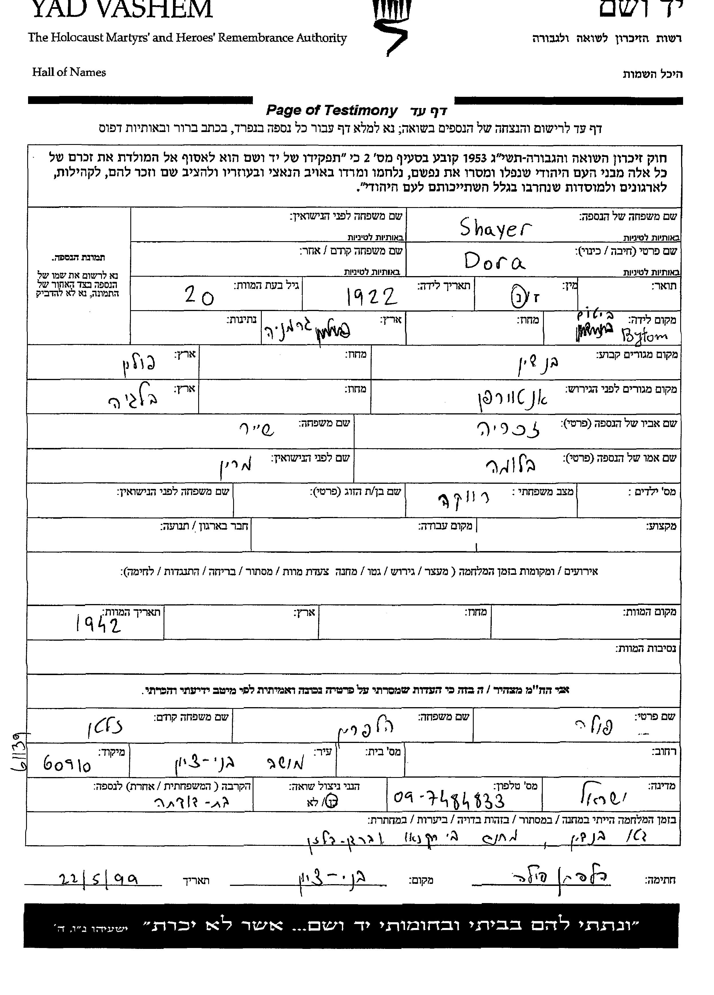 Shayer Dora 1922 Bendzin, Pologne Feuille de témoignage