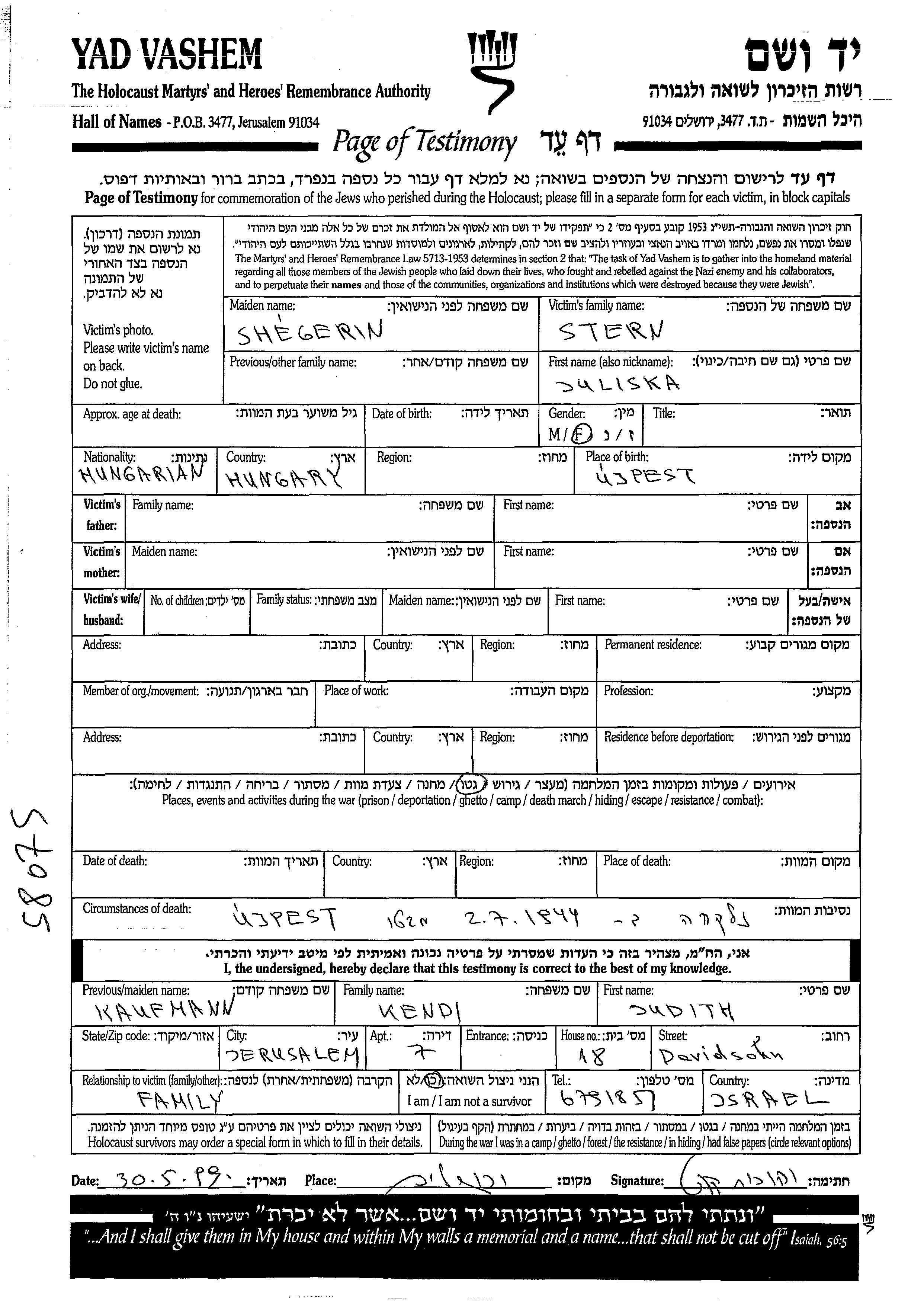 Yad Vashem - Pages of Testimony Names Memorial Collection