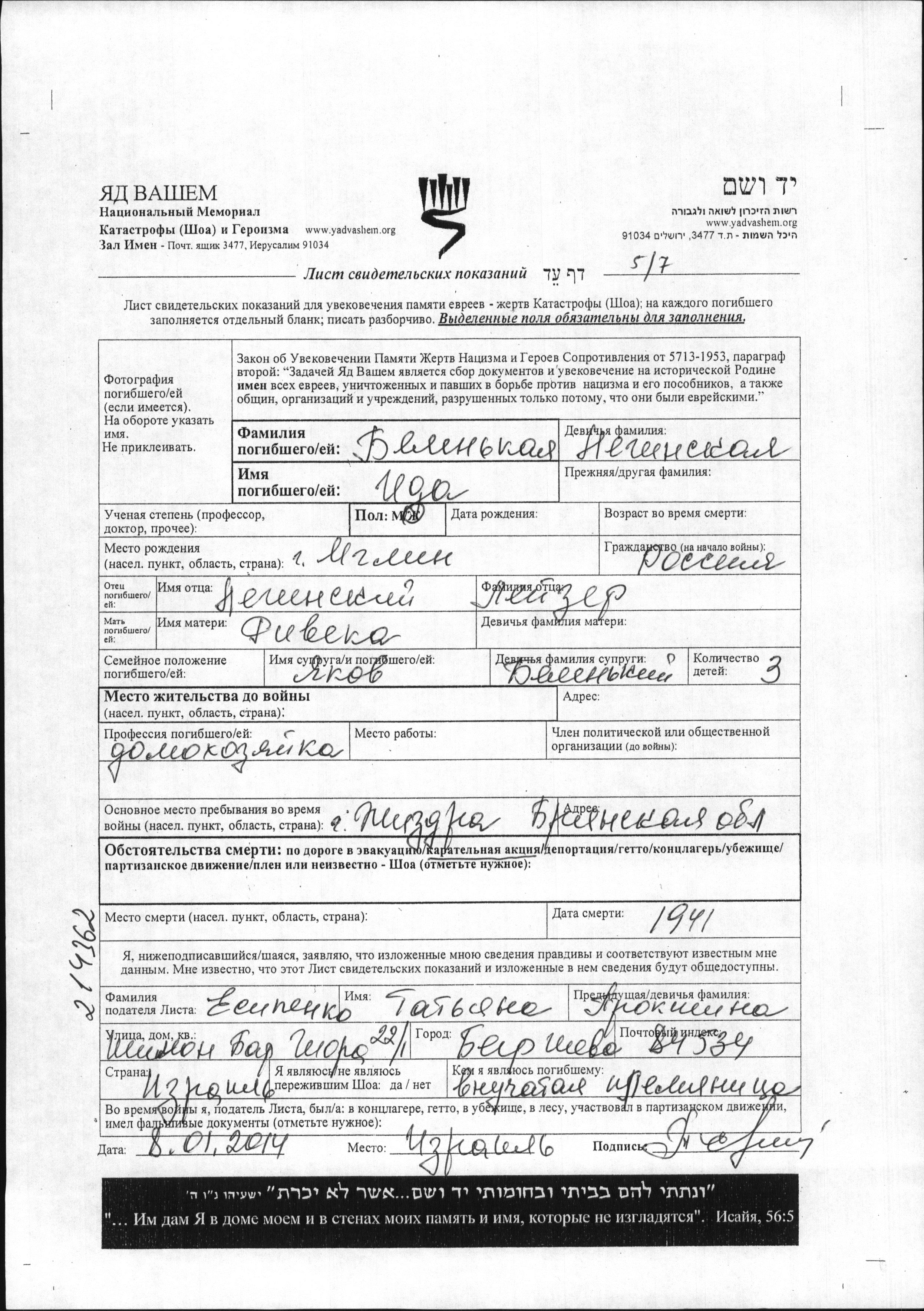 Belenkaya Ida endroit inconnu, Feuille de témoignage