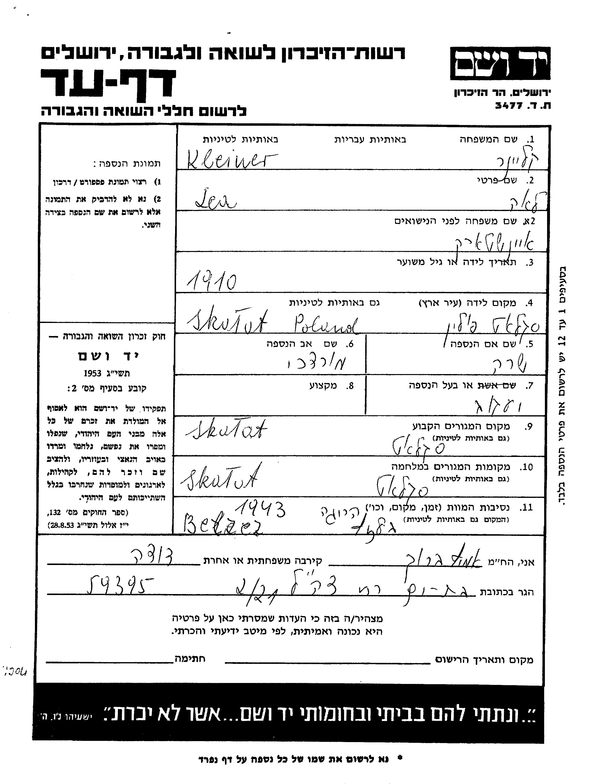 Lea Kleiner née Einshtark est née à Skalat, Pologne en 1910, fille de Mordechai et de Sara. Elle était Mariée à Yaakov. Avant la seconde guerre mondiale elle vivait à Skalat, Pologne. Pendant la guerre, elle était à Skalat, Pologne.