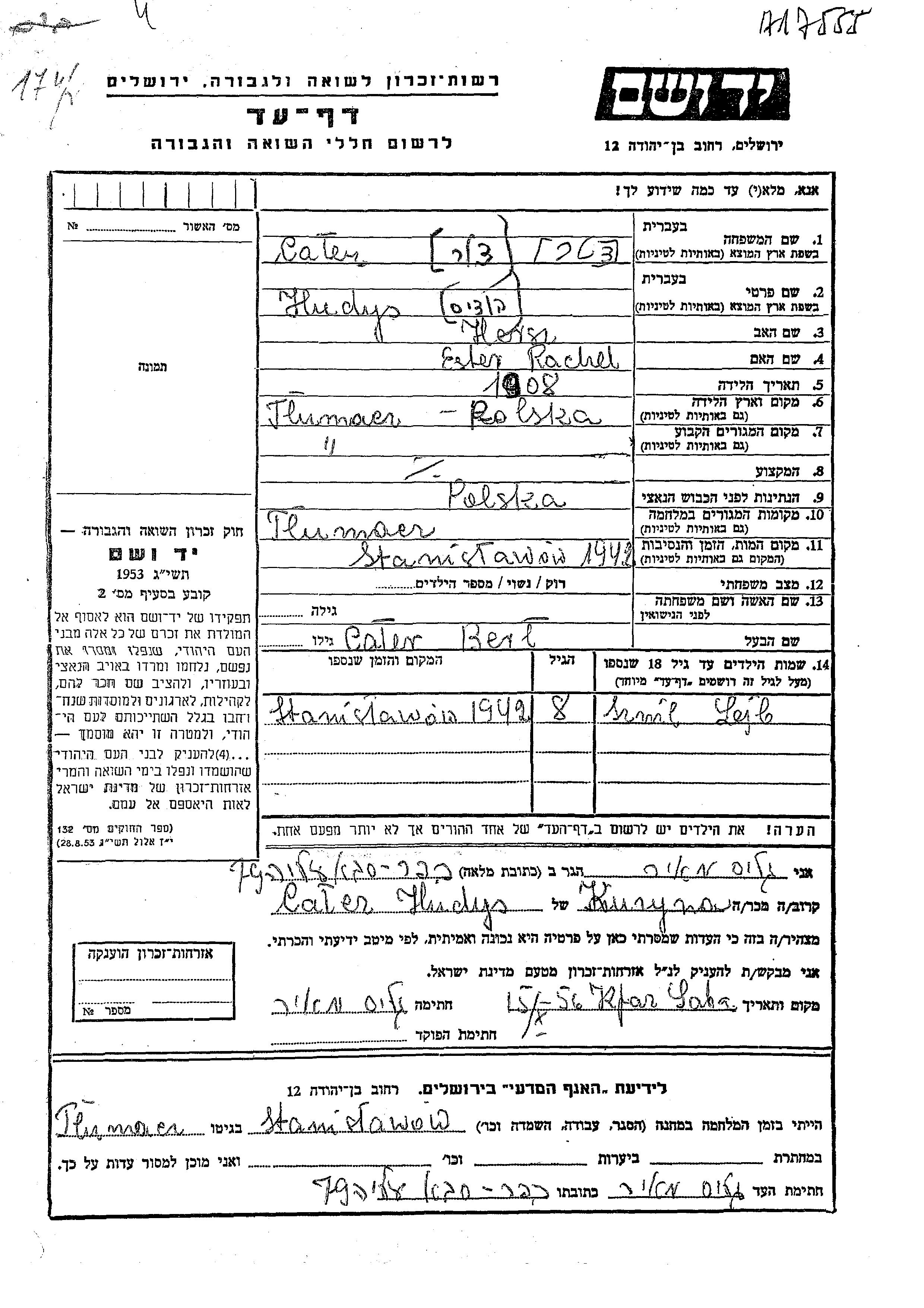 Hudys Caler Tzeter est née à Tłumacz, Pologne en 1908, fille de Hersz et de Ester Rachel. Elle était Mariée à Berl. Avant la seconde guerre mondiale elle vivait à Tłumacz, Pologne. Pendant la guerre, elle était à Tłumacz, Pologne.