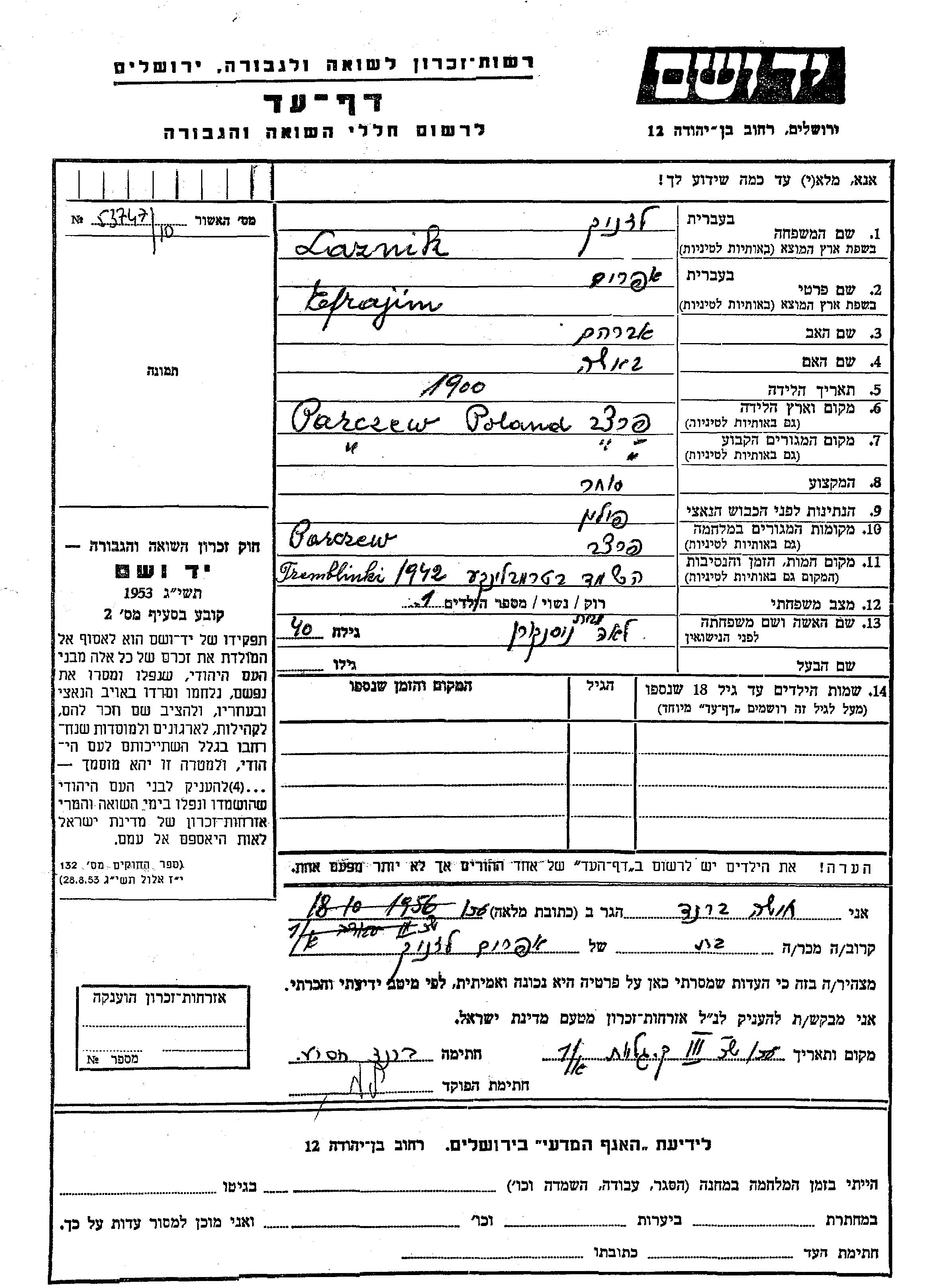 Laznik Efraim 1900 Parczew, Pologne Feuille de témoignage