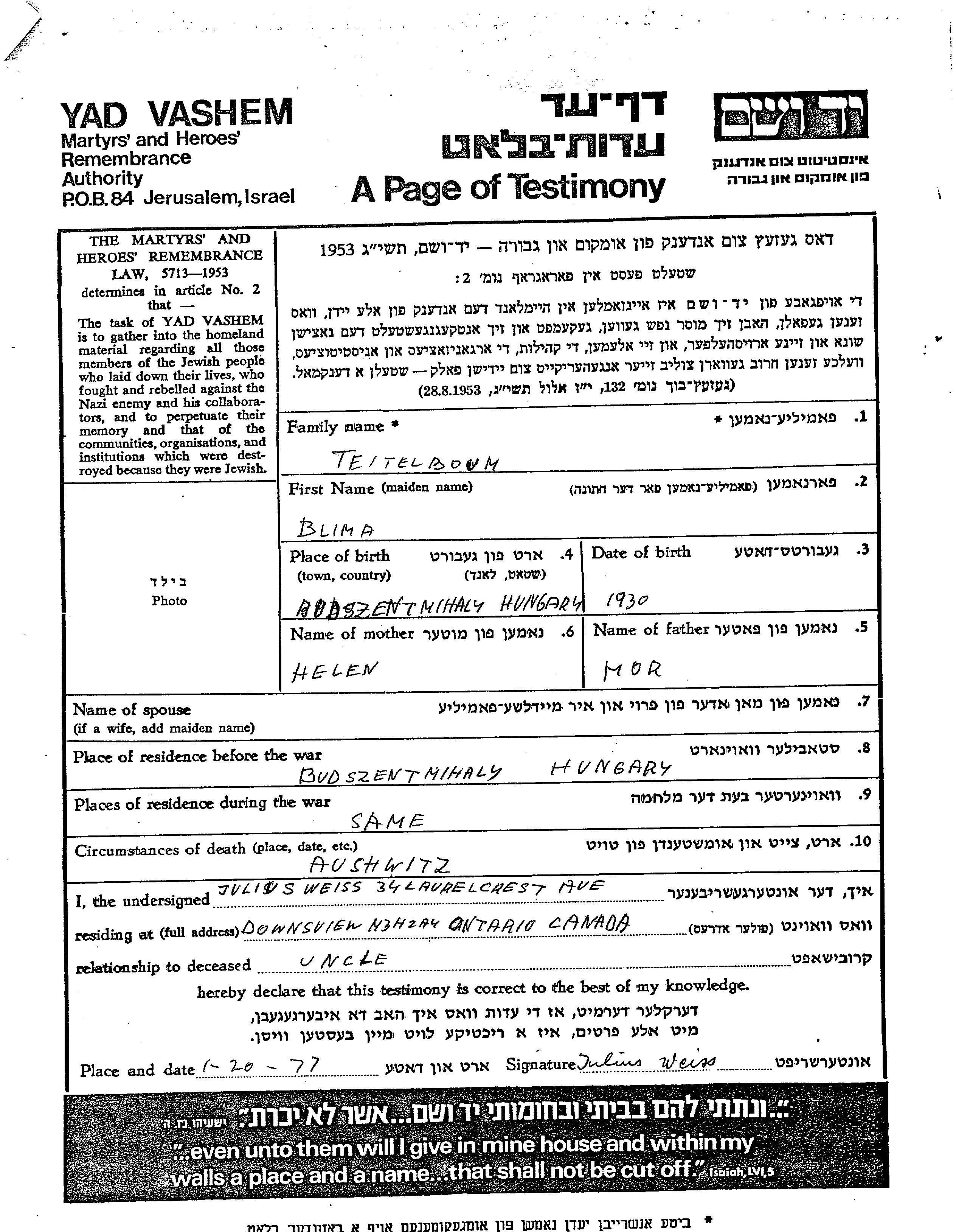 Teitelboum Blima 1930 Budszentmihaly, Hongrie Feuille de témoignage