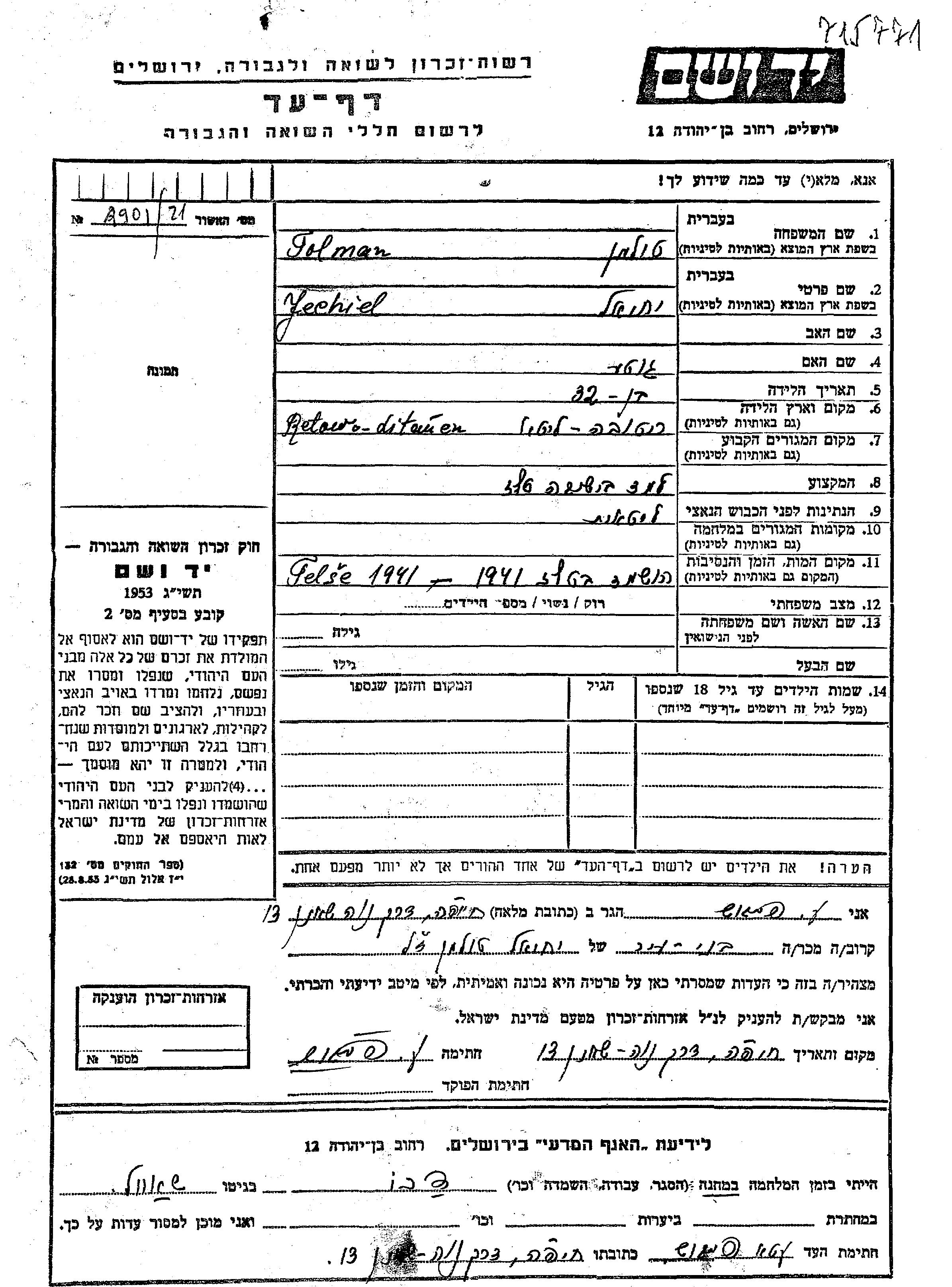 Tolman Jechiel endroit inconnu, Feuille de témoignage