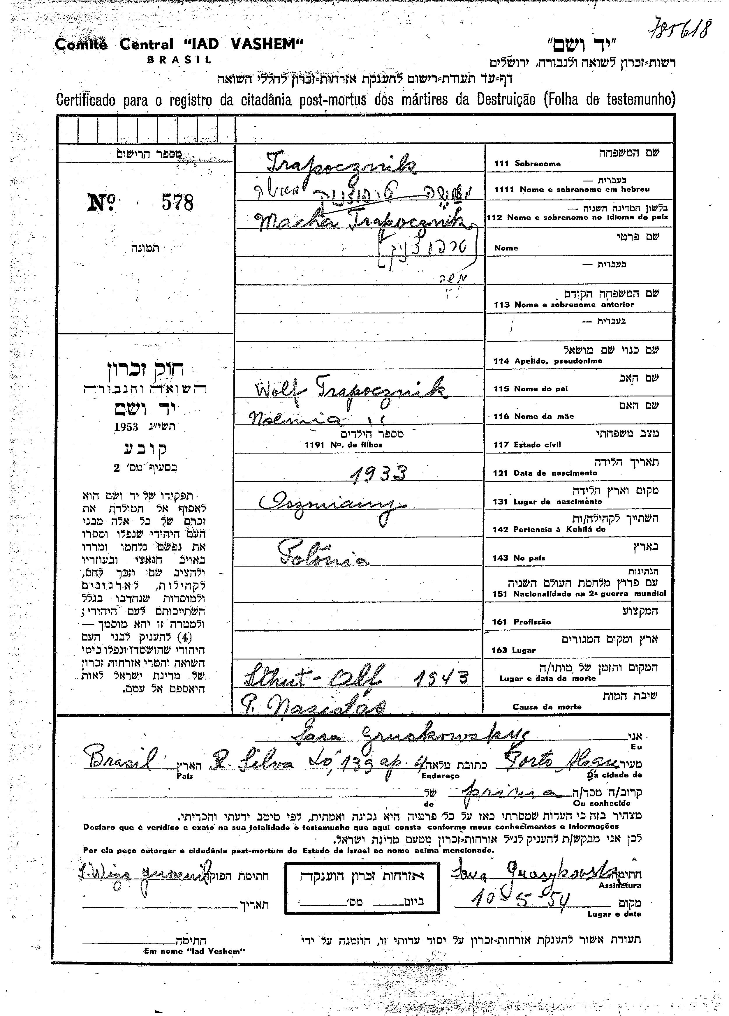 Trapocznik Macha Masha Moshe 1933 endroit inconnu, Feuille de témoignage