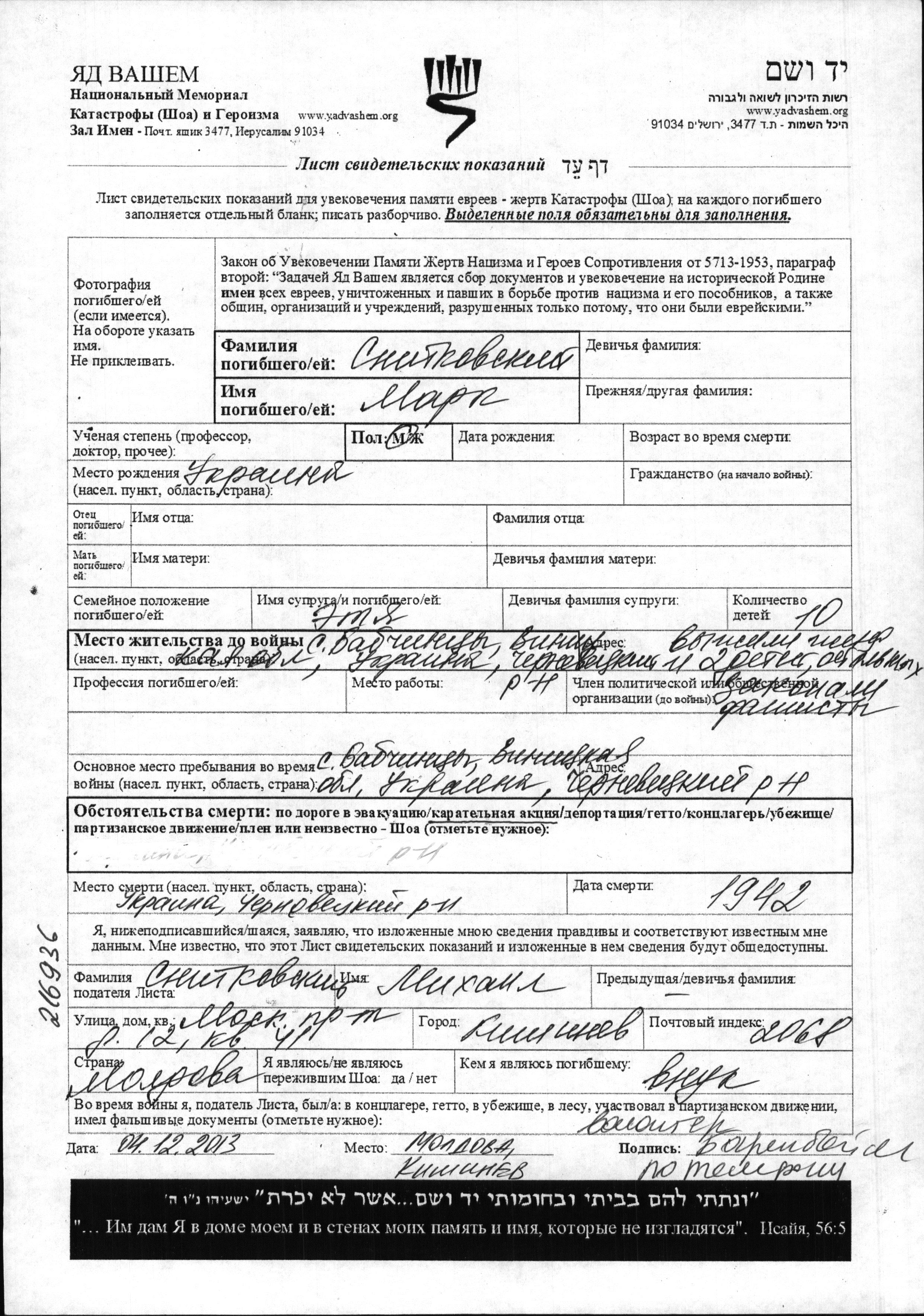 Snitkovskiy Mark Babchintsy, Ukraine (URSS) Feuille de témoignage