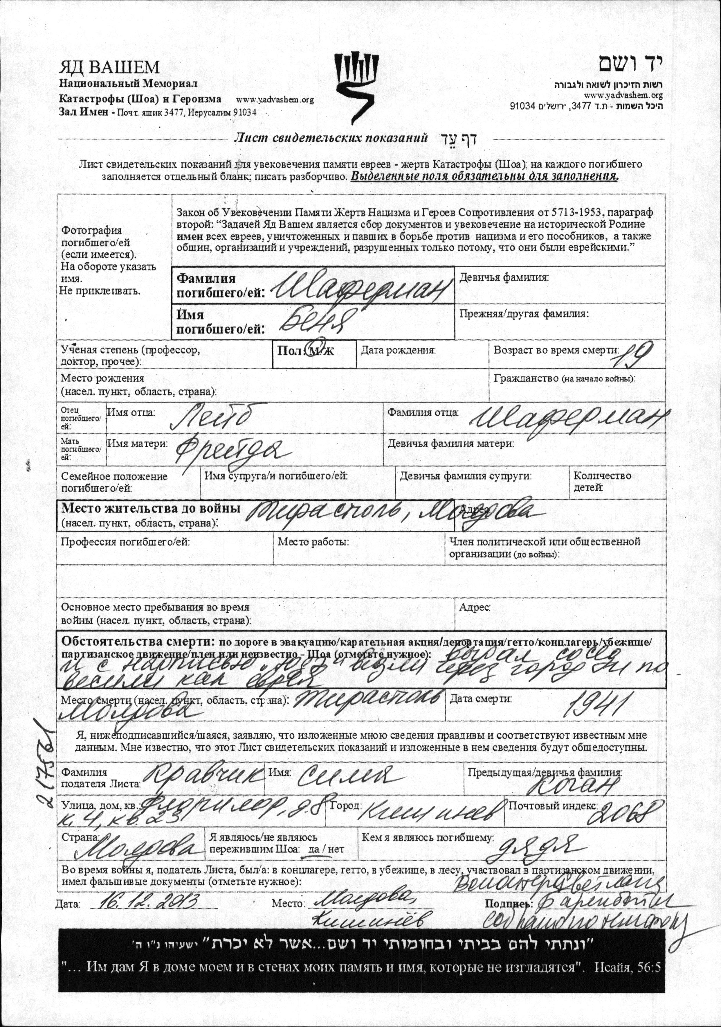 Shaferman Benya 1922 Tiraspol, Ukraine (URSS) Feuille de témoignage