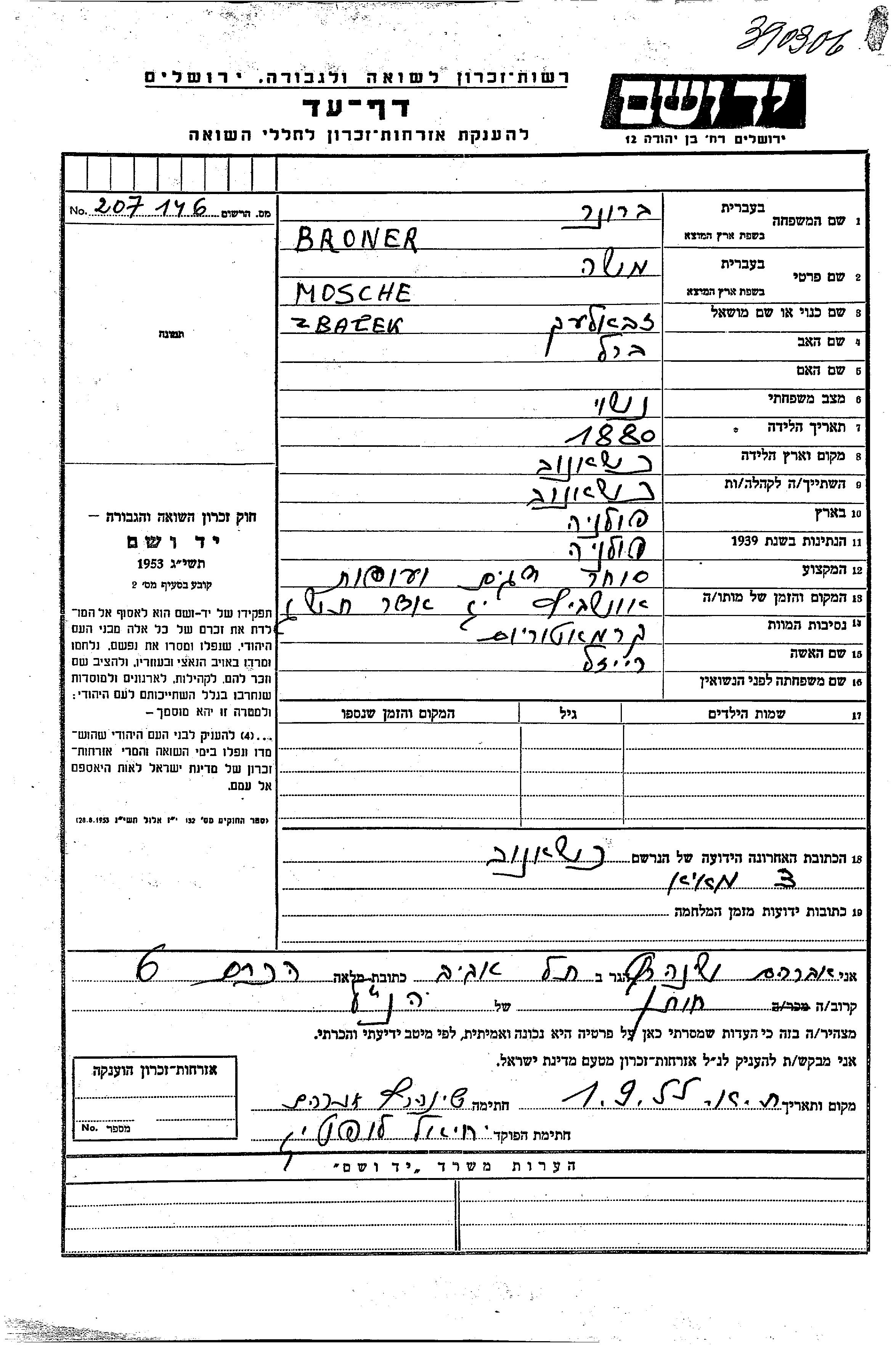 Mosche Broner est né à Kshanov, Pologne en 1880, fils de Berl. Il était סוחר דגים ועופות et Mariée à Reizl. Avant la seconde guerre mondiale il vivait à Kshanov, Pologne. Au cours de la guerre, il était à Kshanov, Pologne.