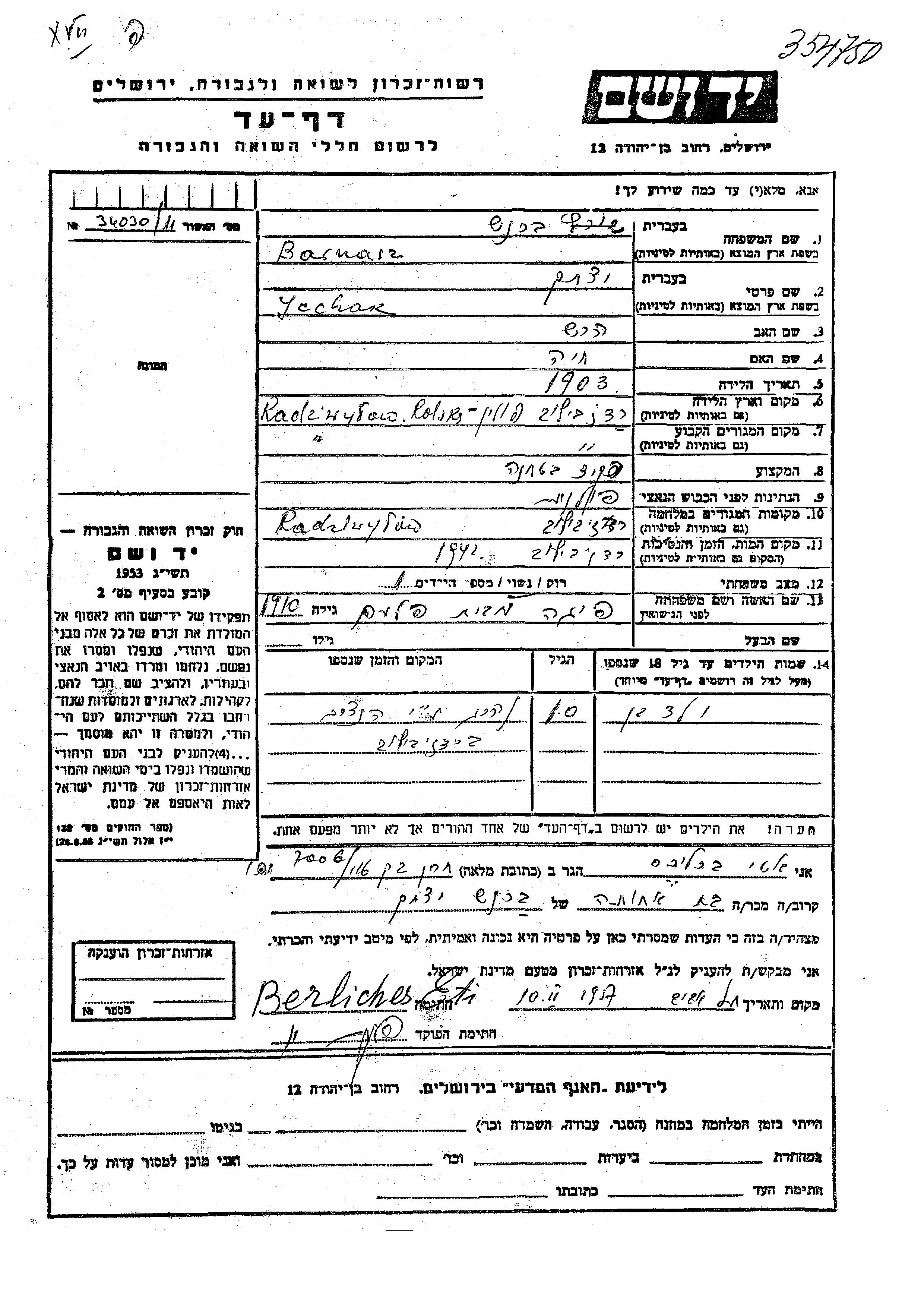 Barnasz Ycchak 1903 Radziwillow, Pologne Feuille de témoignage
