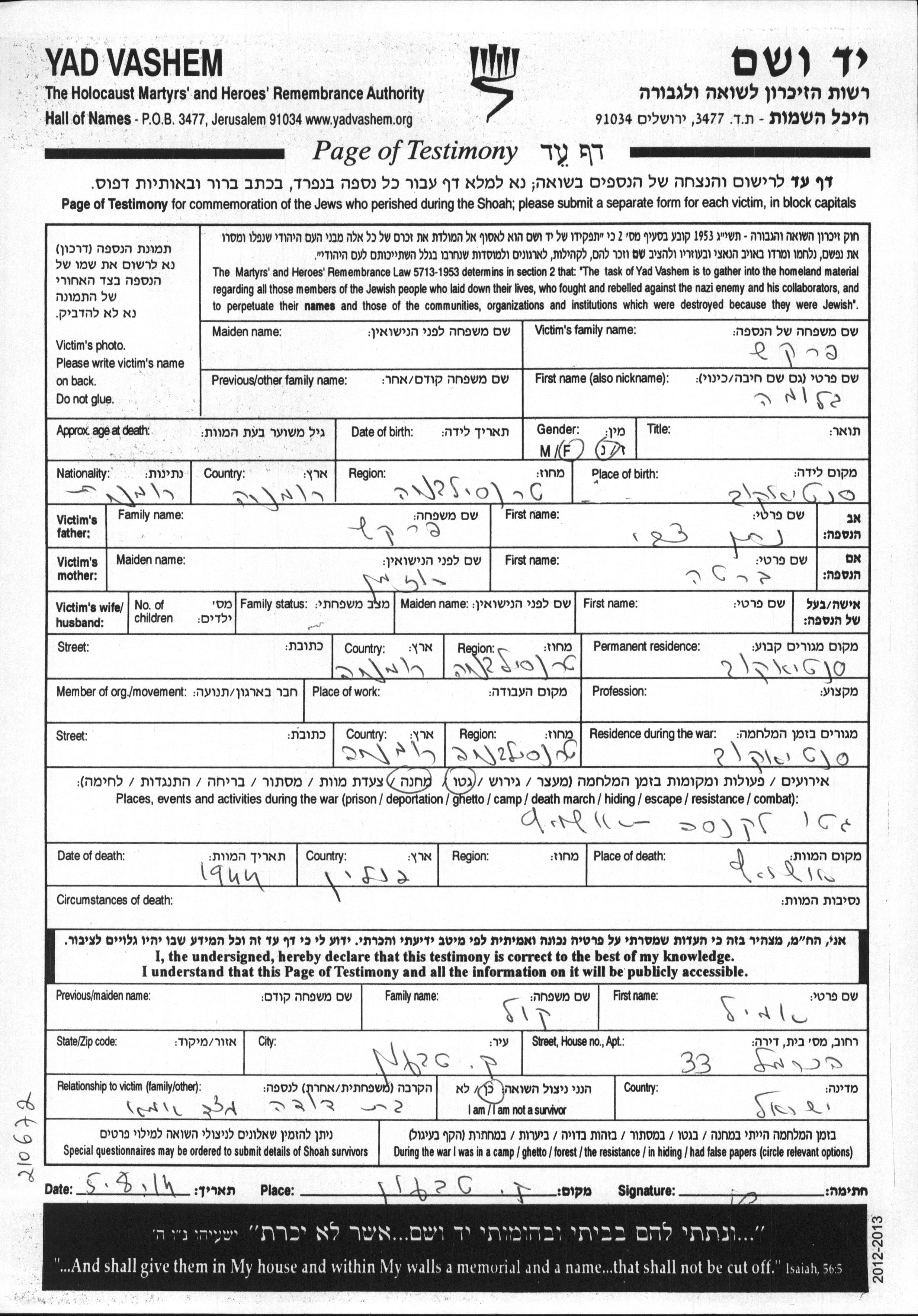 Yad Vashem - Pages of Testimony Names Memorial Collection