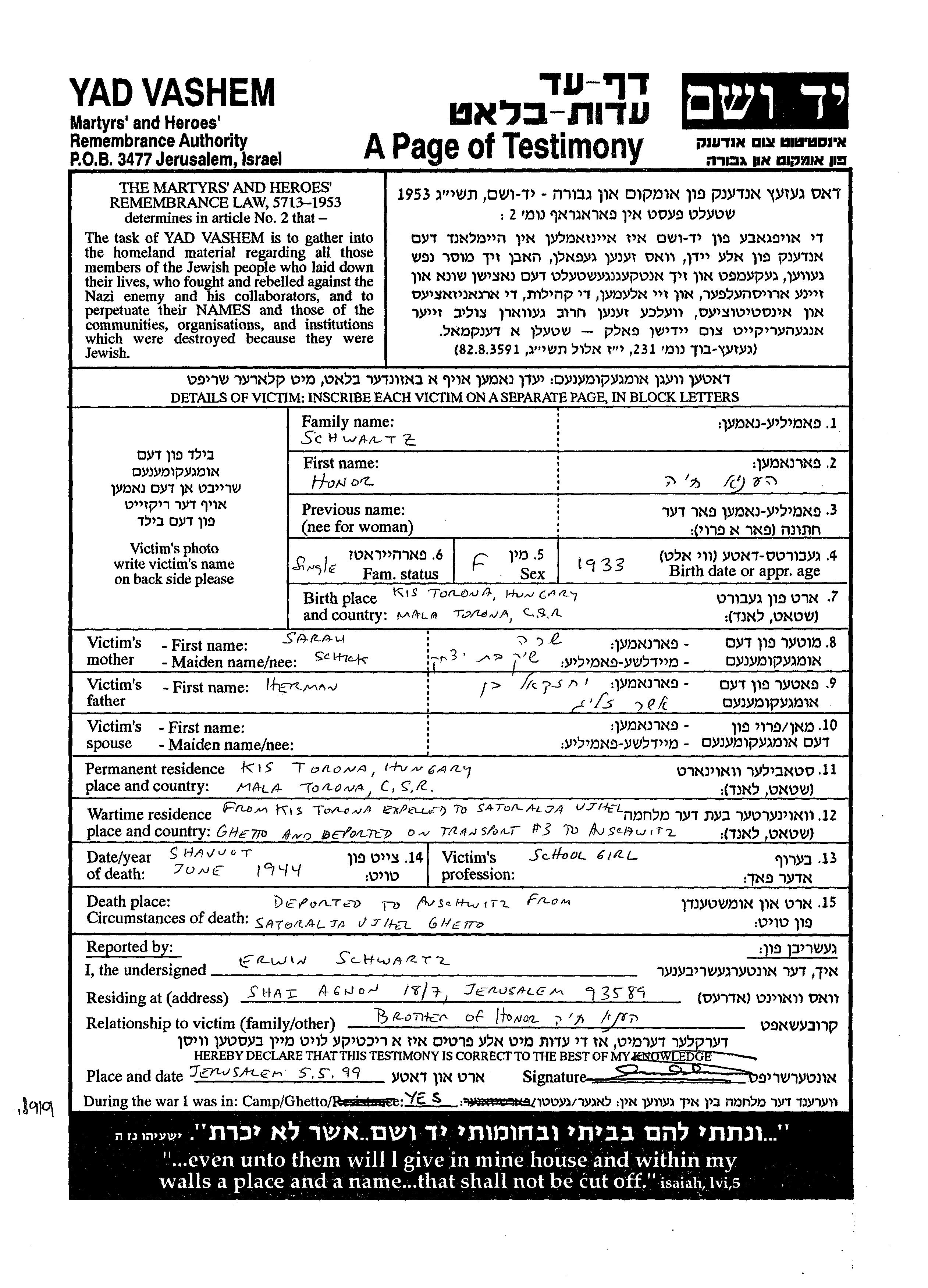Schwartz Honor Henia Khaia 1933 Kistoronya, Tchécoslovaquie Feuille de témoignage