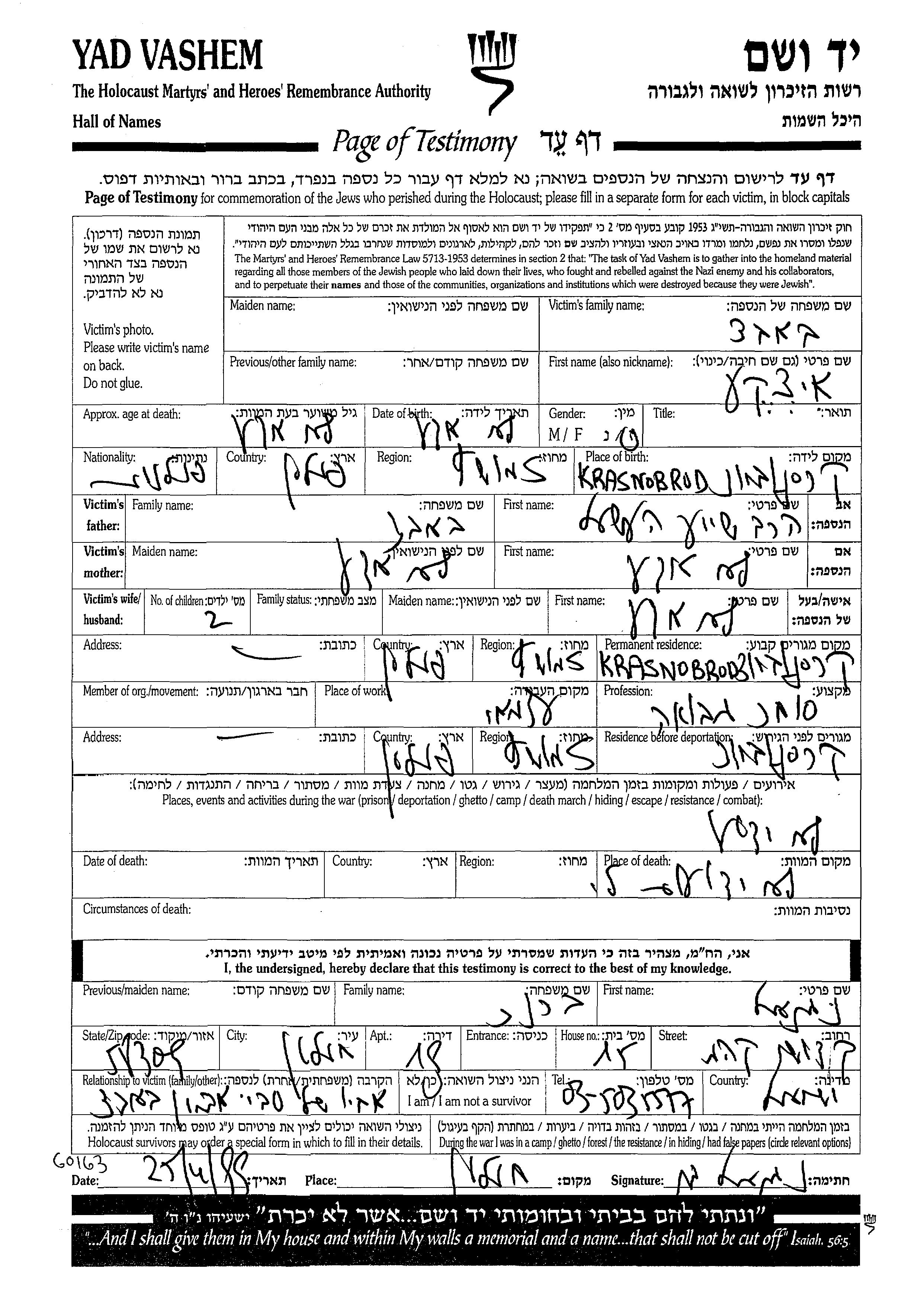 Babad Yitzkhak Krasnobrod, Pologne Feuille de témoignage