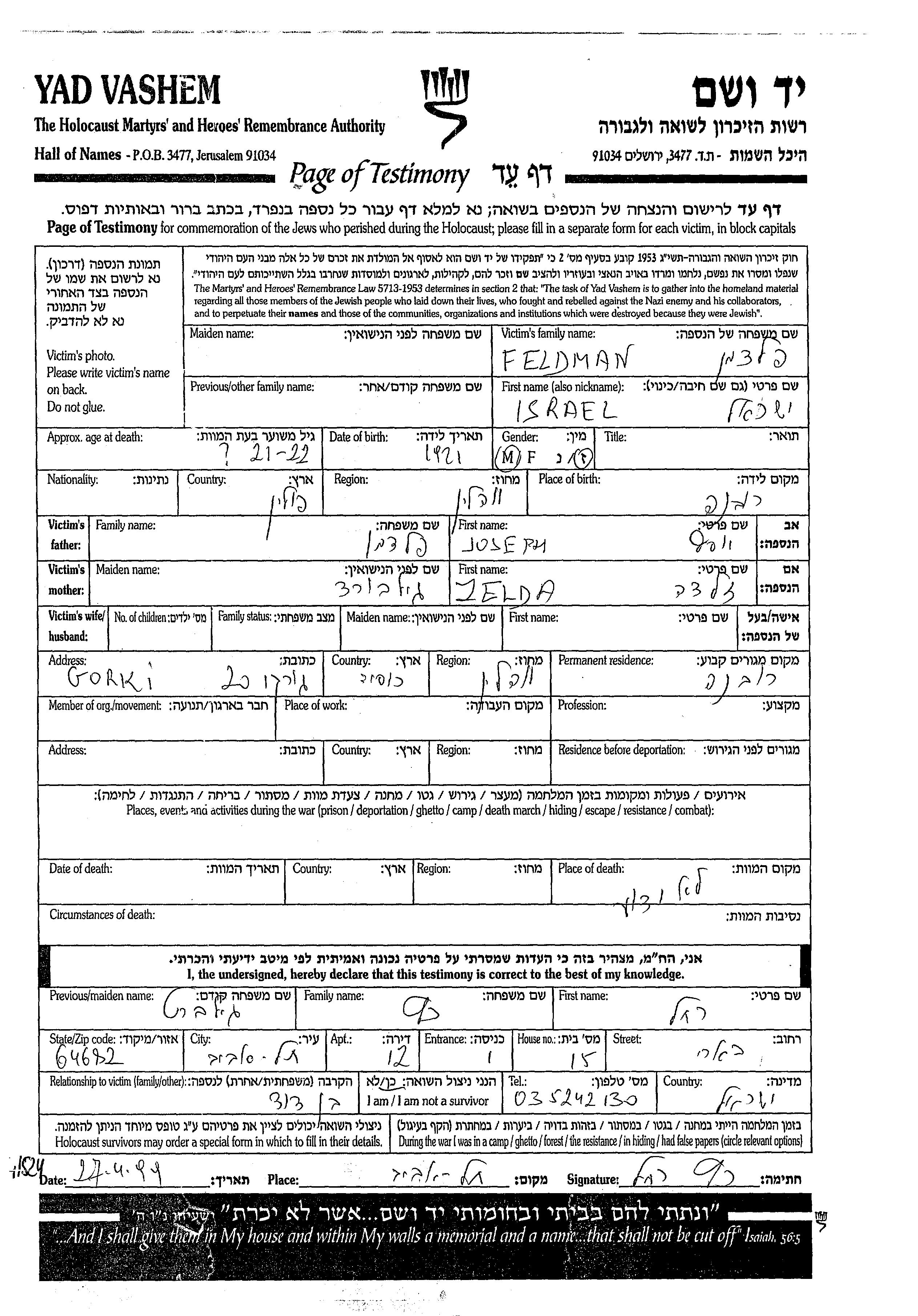 Feldman Israel 1921 Rowne, Pologne Feuille de témoignage