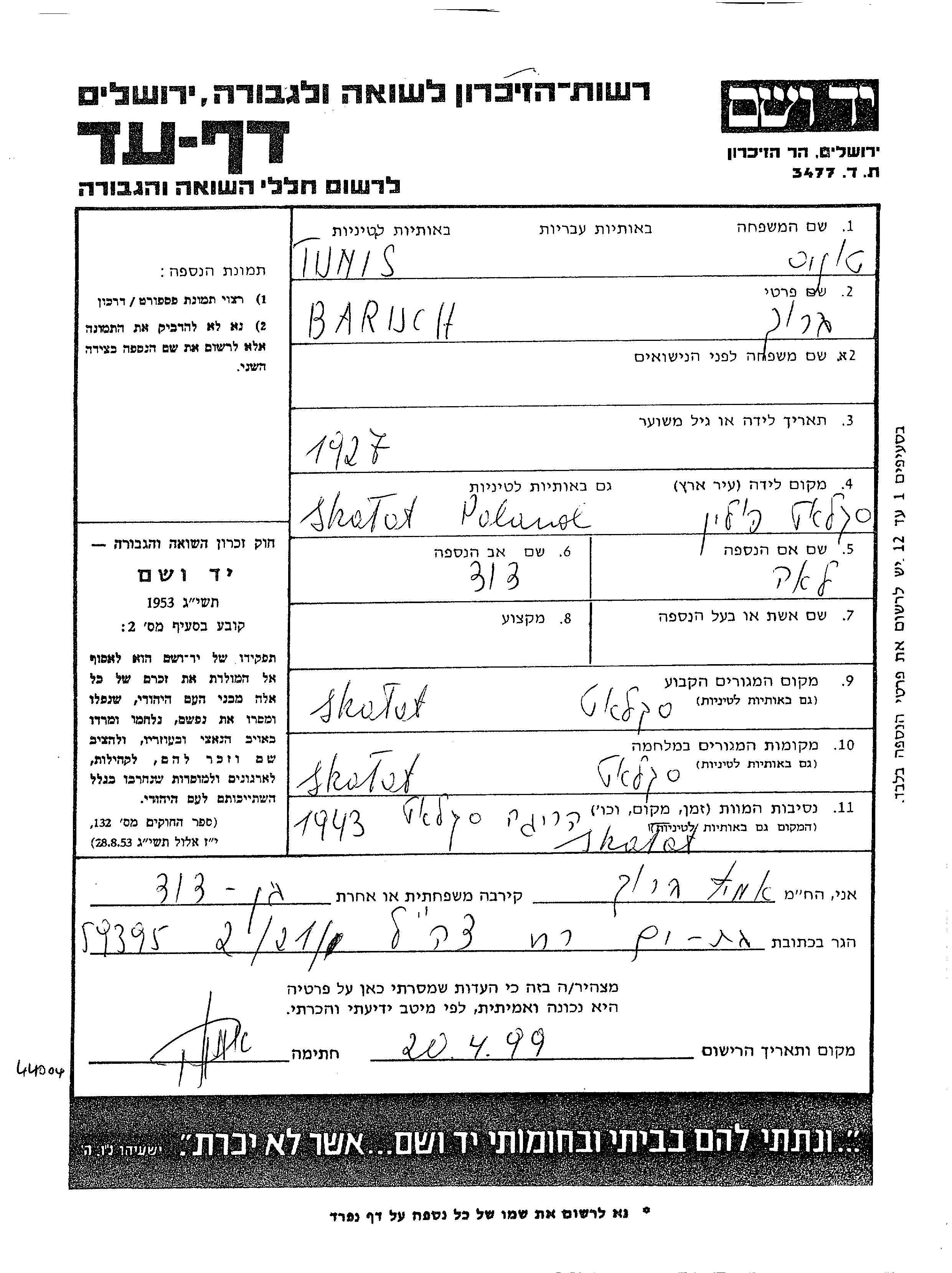 Tunis Baruch 1927 Skalat, Pologne Feuille de témoignage