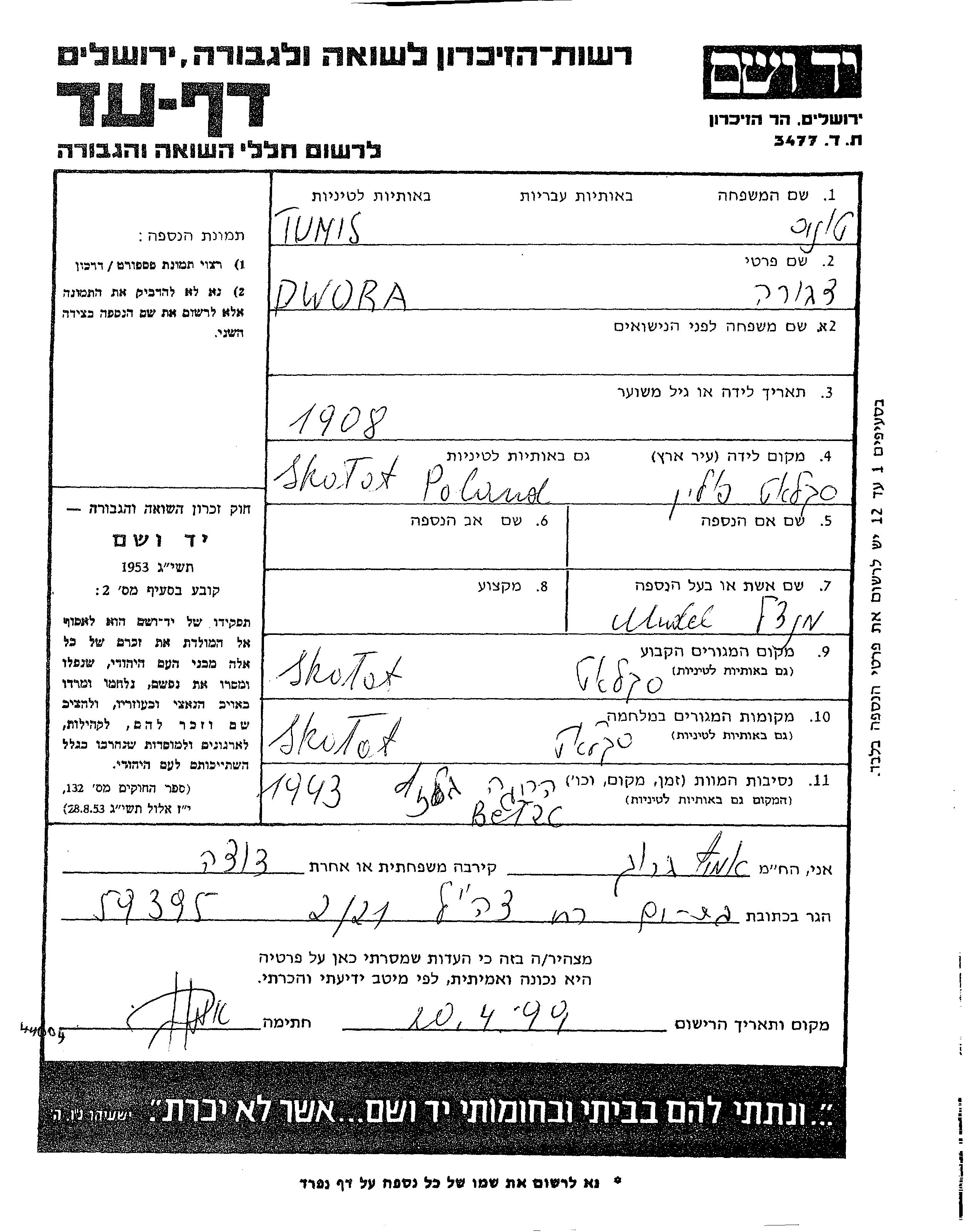 Dwora Tunis est née à Skalat, Pologne en 1908. Elle était Mariée à Mutel Mendel. Avant la seconde guerre mondiale elle vivait à Skalat, Pologne. Pendant la guerre, elle était à Skalat, Pologne.