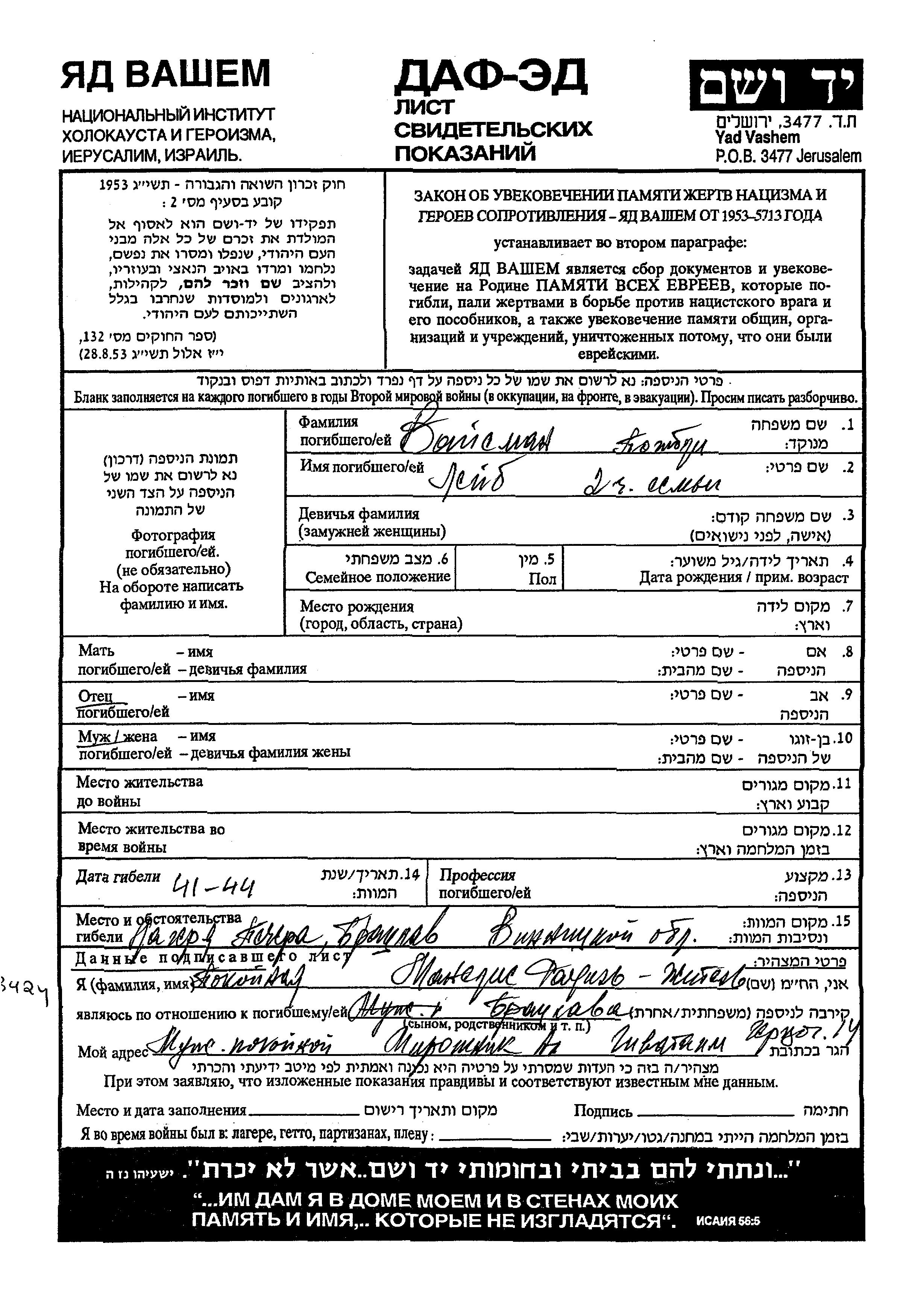 Vaisman Leib endroit inconnu, Feuille de témoignage