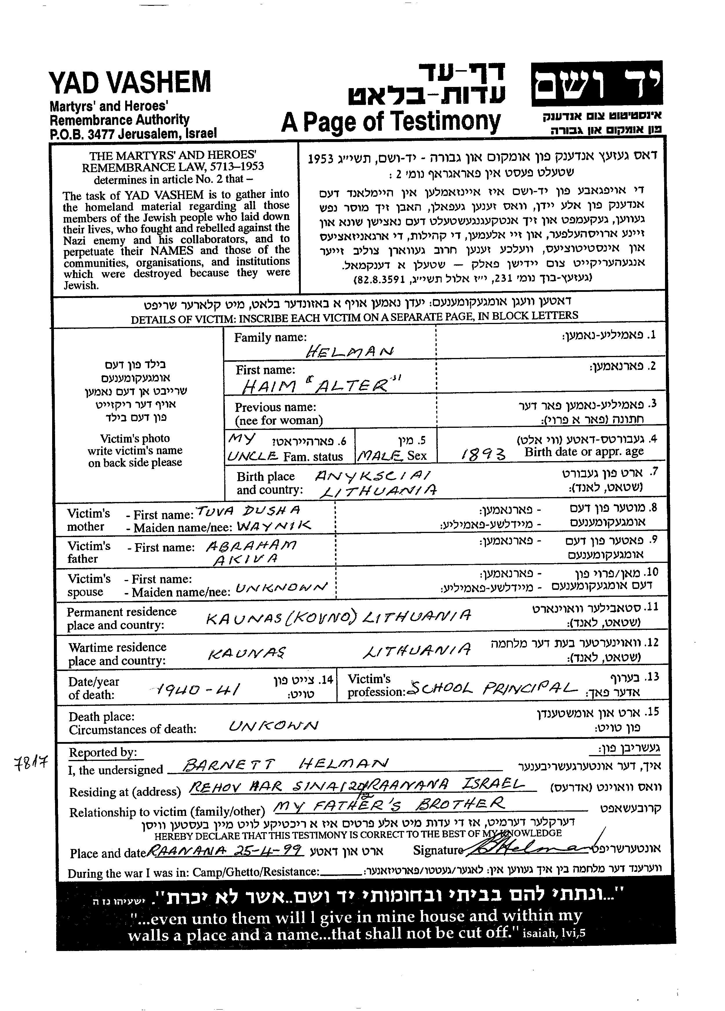 Helman Haim Alter 1893 Kaunas, Lituanie Feuille de témoignage