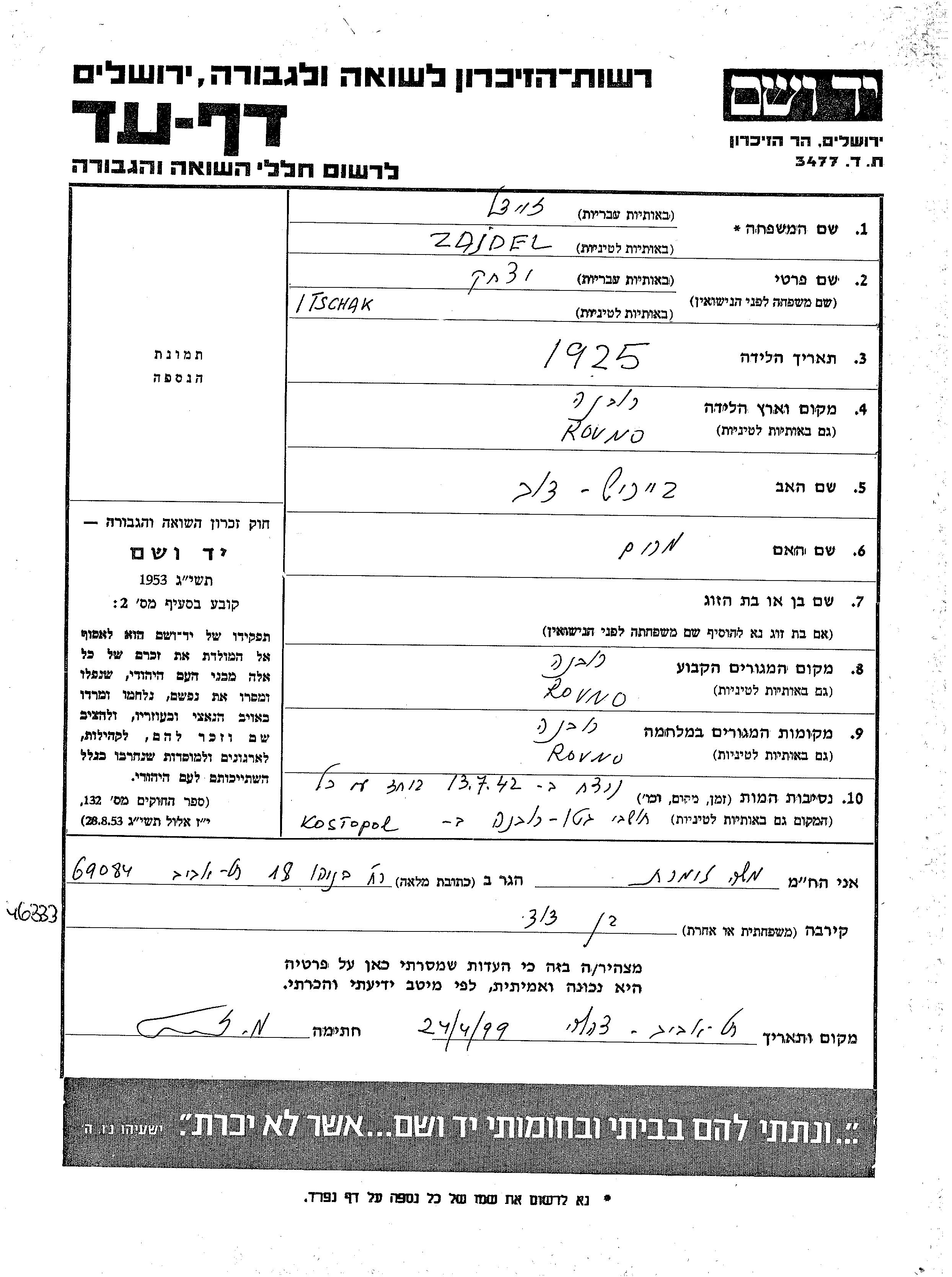 Zeidel Itschak 1925 Rowno, Pologne Feuille de témoignage