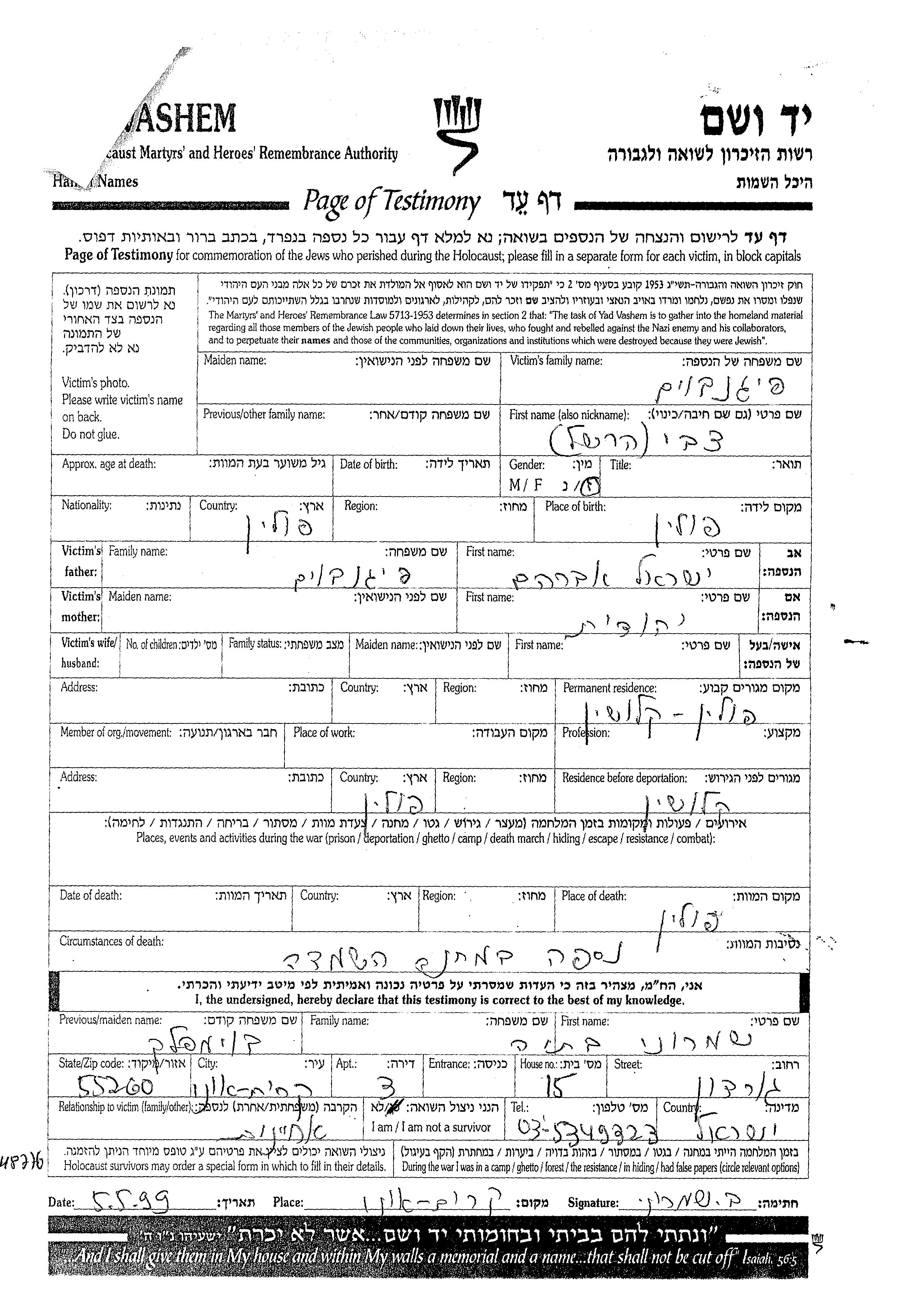 Yad Vashem - Pages of Testimony Names Memorial Collection