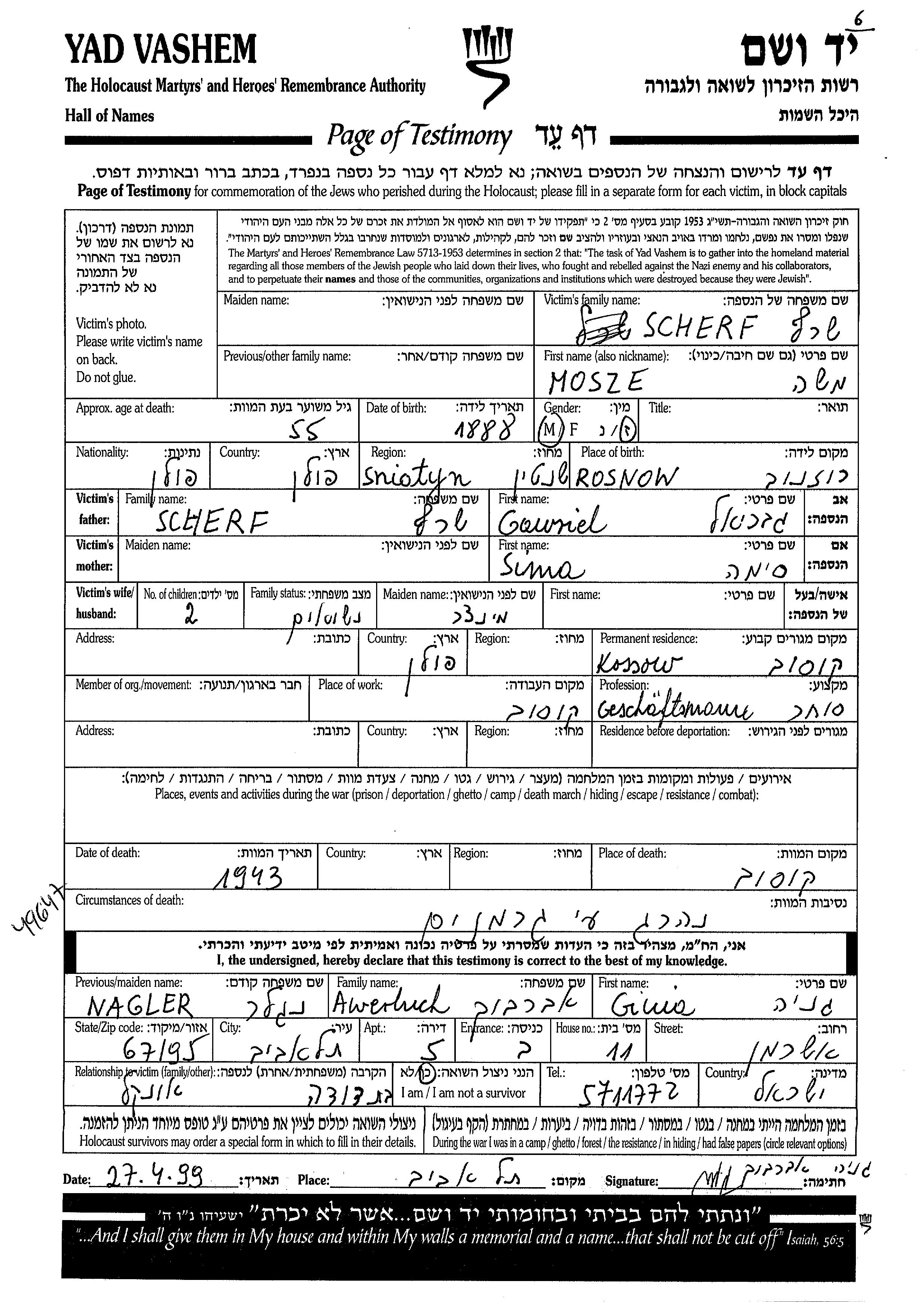 Mosze Scherf est né à Roznow, Pologne en 1888, fils de Gawriel et de Sima. Il était Commerçant/e et Marié. Avant la seconde guerre mondiale il vivait à Kosow Pokucki, Pologne.