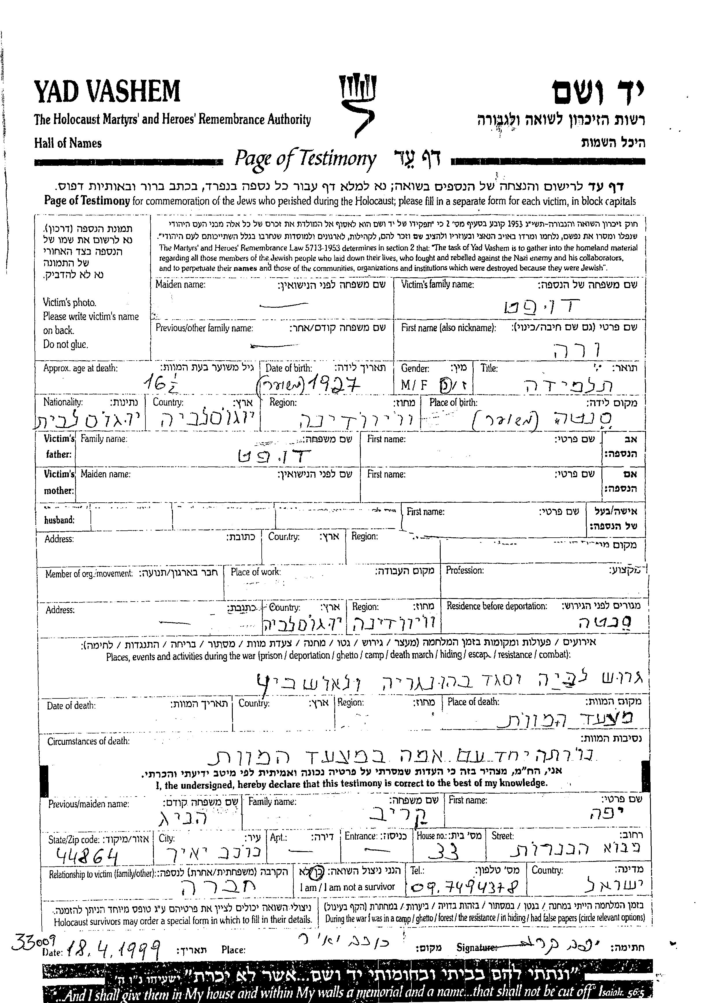 Yad Vashem - Pages of Testimony Names Memorial Collection