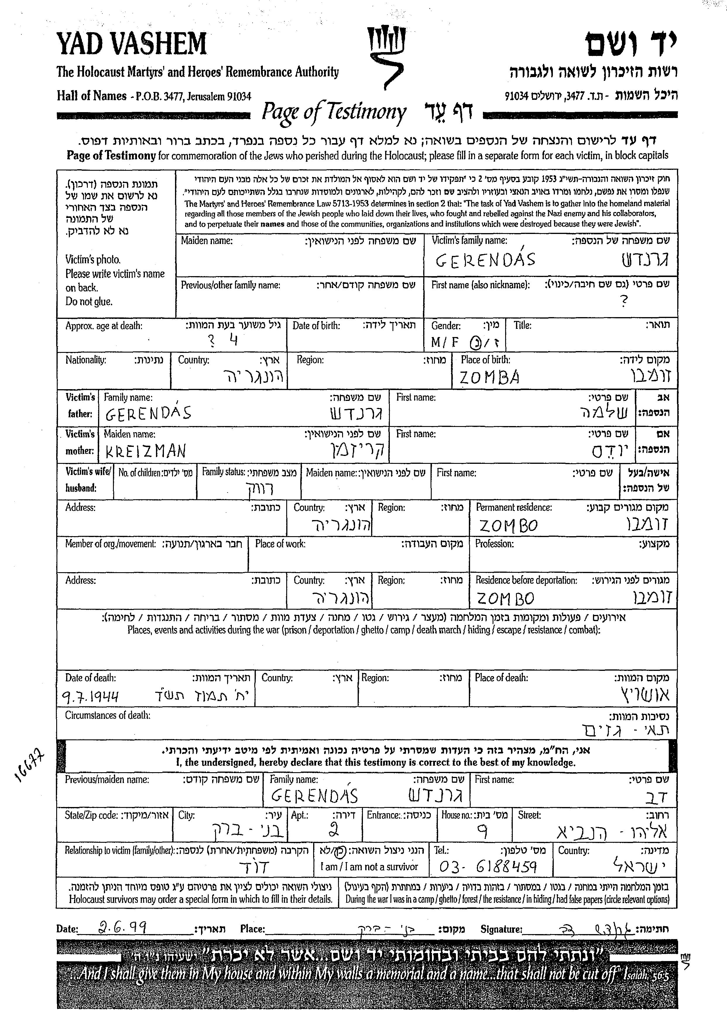 Gerendas prénom inconnu Zomba, Hongrie Feuille de témoignage